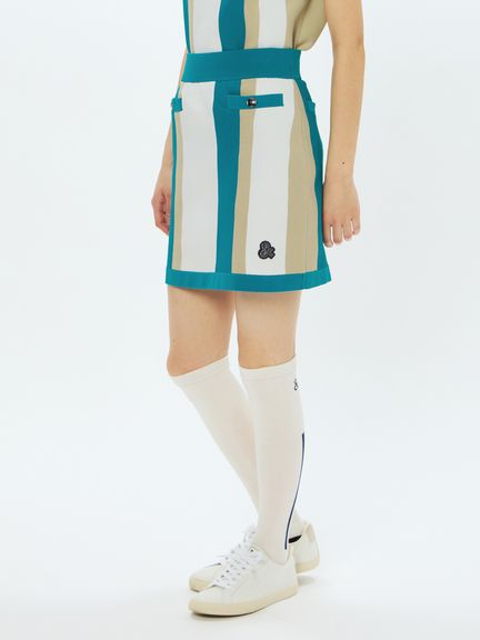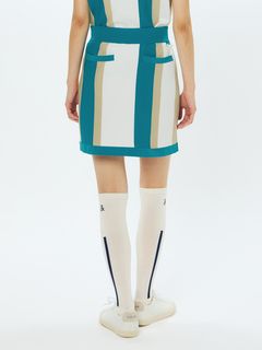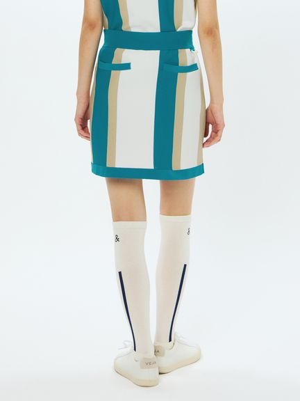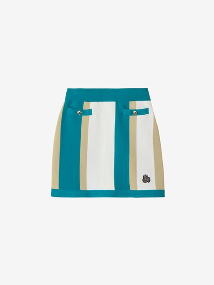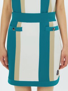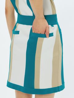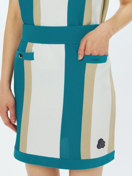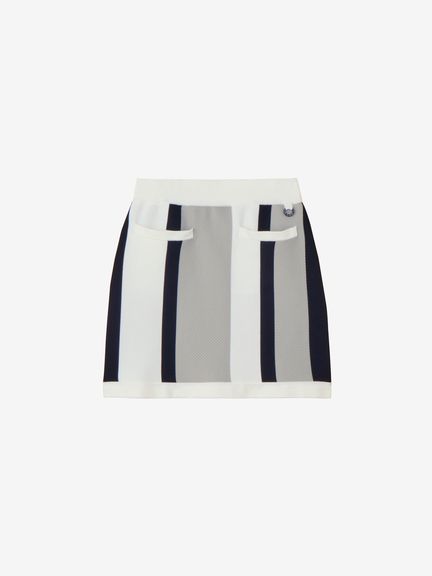 軽さとストレッチ性を追求したスポーティ・ジャカードニットで仕上げたスカート。マルチストレッチで動きやすい軽量ジャカードニット(環境配慮型のPETリサイクル・ポリエステル糸を一部使用)を採用し、さらに部分的にメッシュ編みニットを加えることでより軽快な着用感を目指しました。家庭で洗濯洗い(ネット使用)が可能で扱いやすいのも嬉しいポイントです。天竺編み、メッシュ編み、変形編みといった3種類の編み地を組み合わせたこだわりデザイン。フロントにもバックにも両サイドにポケットを施したユーザビリティーの高い一枚です。