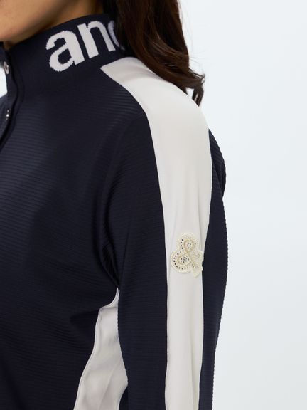 - 身生地:4WAYリップル(ポリエステル82%、ポリウレタン18%)袖・脇切替(ポリエステル90%、ポリウレタン10%)衿リブ(ポリエステル95%、ポリウレタン5%)