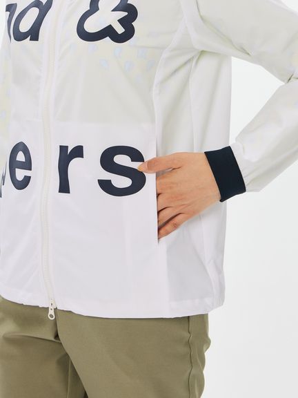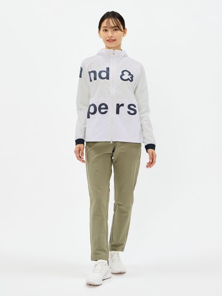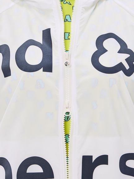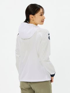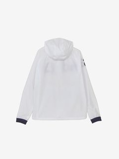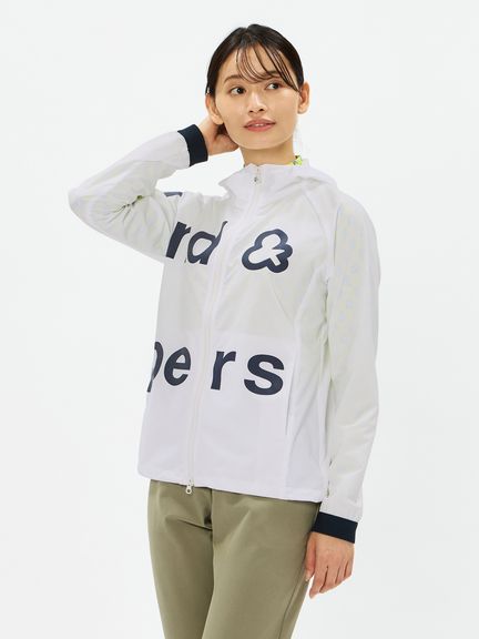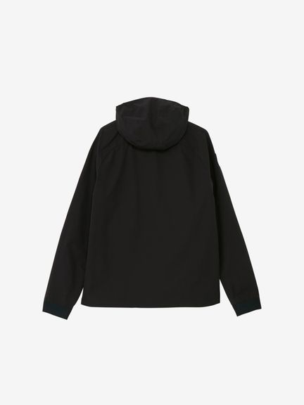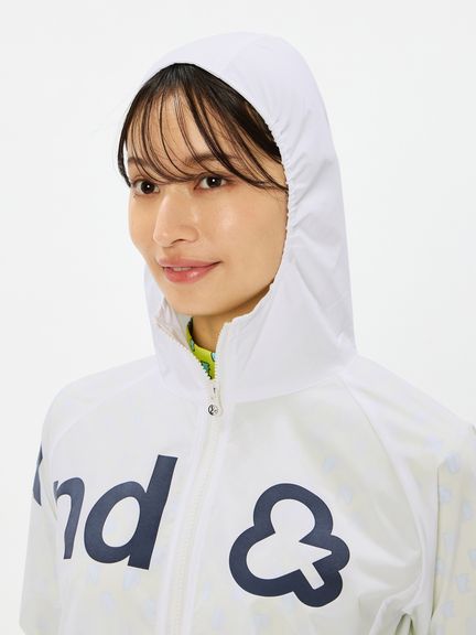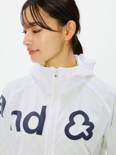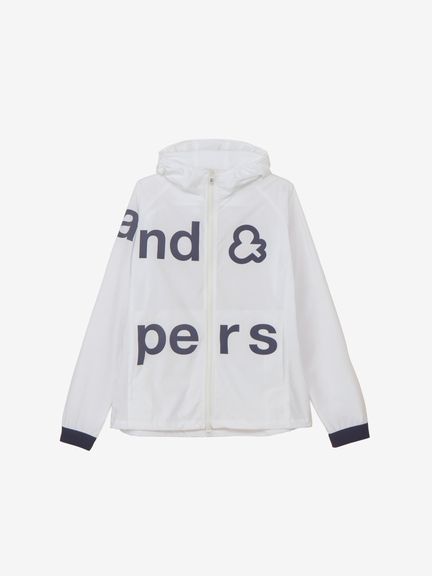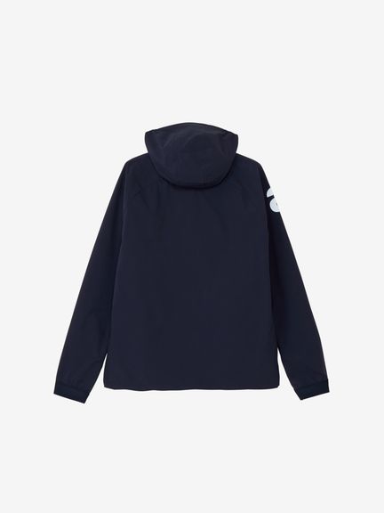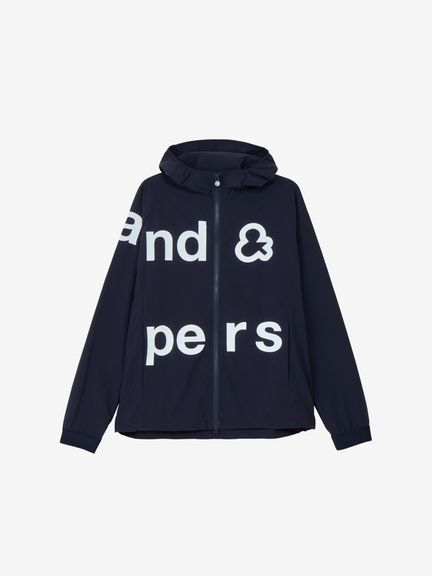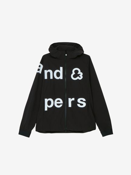 はっ水性と通気性(蒸れにくさ)の両方を併せ持つマルチウェザーフーディージャケット。ストレッチ性・はっ水性・透湿性といった多くの機能を搭載した、ハリ感のあるタイプライター素材(環境配慮型のリサイクルポリエステル糸を一部使用)。素材の軽さだけでなく、フラットな縫い代を実現するY字リブ使い、裏側の始末・縫製仕様でも軽量化を実現するための工夫などを凝らしたプロダクト。肩回りの動きやすさ&雨水の浸入軽減を考慮したラグランスリーブデザインを採用しました。フロントを横断する大きなプリントが特徴的です。