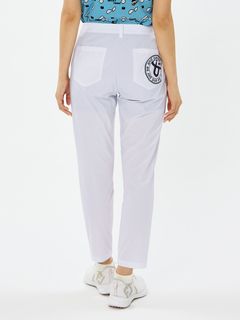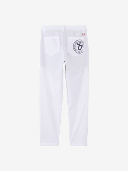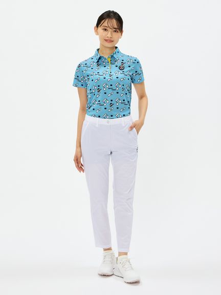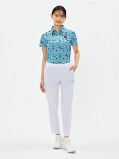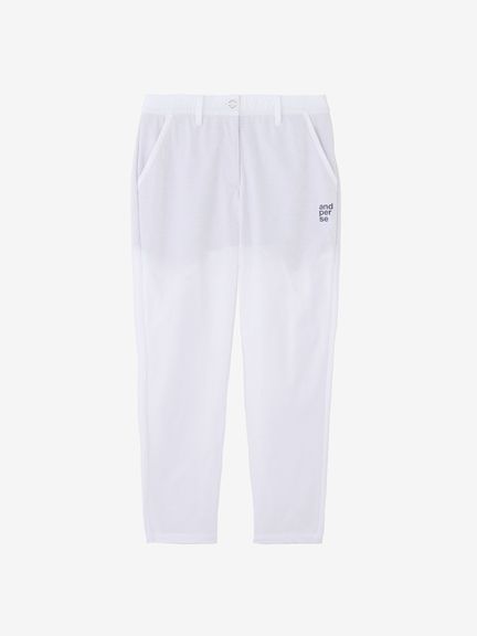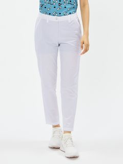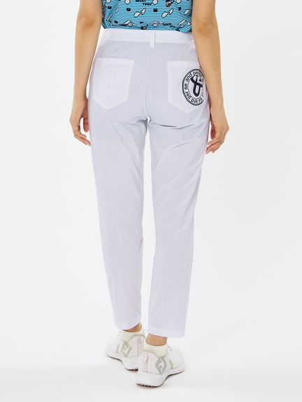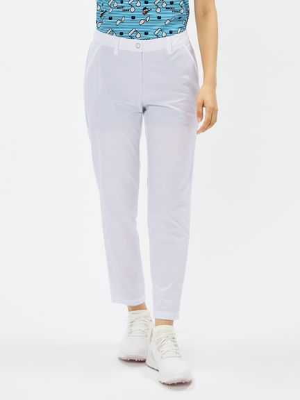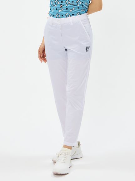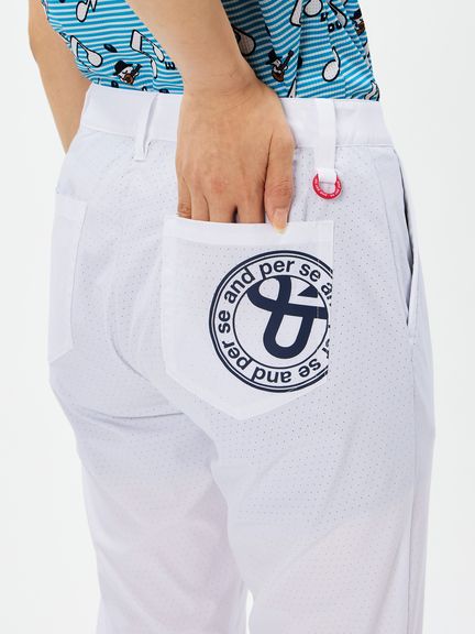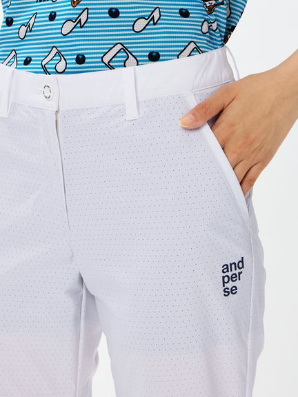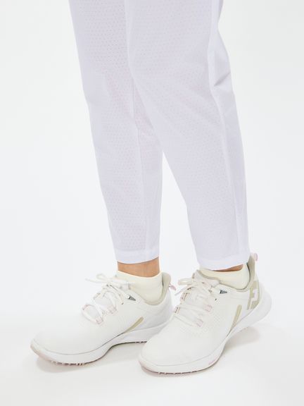 程よいハリ感のポリエステルタフタにパンチング加工を施したクロップドパンツ。スイングをアシストするマルチストレッチ、はっ水、抗菌防臭といった機能を搭載。これだけの高機能を持ちながら、生地をメッシュ調にパンチング加工することで通気性がとても良くなり高通気を実現。涼しさだけでなく軽量感ある着心地もポイントです。ストレッチ性のあるハーフ裏地仕様で、気になる透けに配慮しています。ウエストベルトにはカーブゴムを入れているので、伸縮性のある仕上がりです。裾上げ済み仕様。