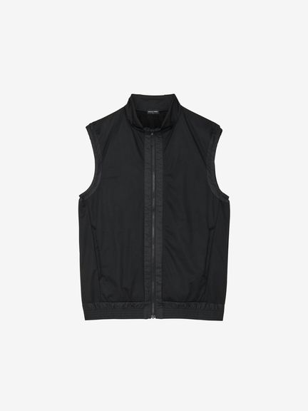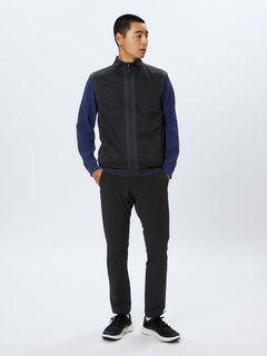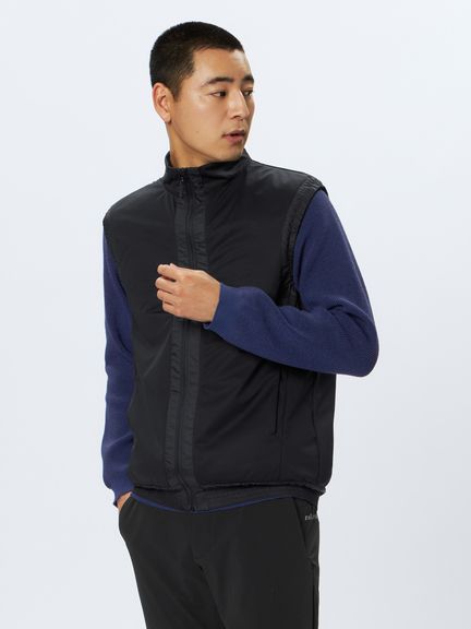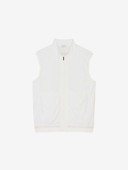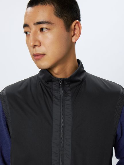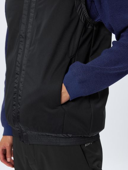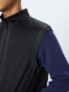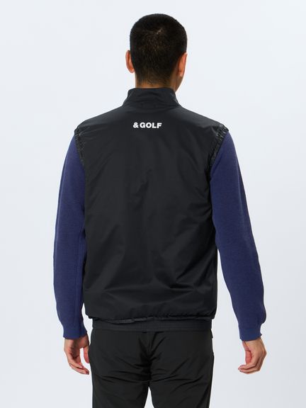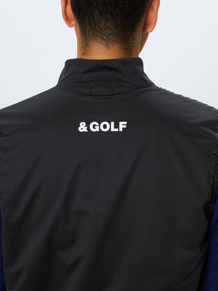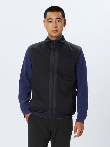&GOLFの代表する日本製ハイゲージカットソー素材46Gサイレントマルチウェイの裏側に、保温中わたの機能を果たす起毛形状メッシュ素材を加えたエアロ2レイヤー素材の極薄保温ベスト。