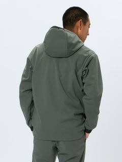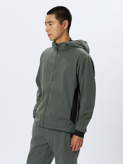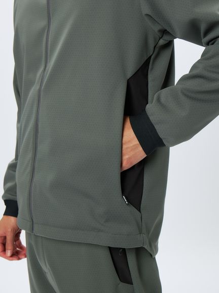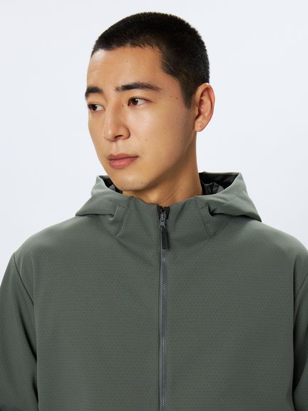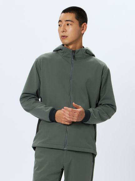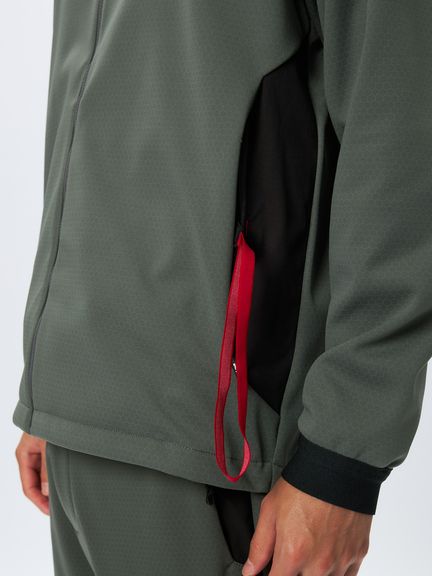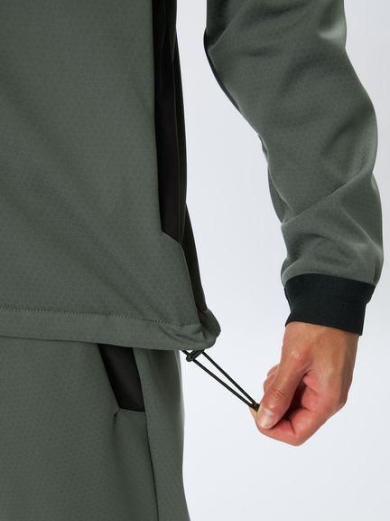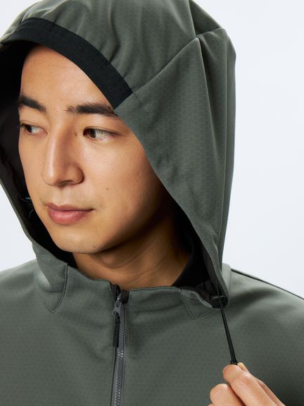 裏側のグリッド構造マイクロフリースが「高い保温性」と「ウォーム&ライトな肌触り」を実現する、透湿防水ストレッチ3レイヤー(ソフトシェル)素材を採用したフルジップブルゾン。