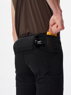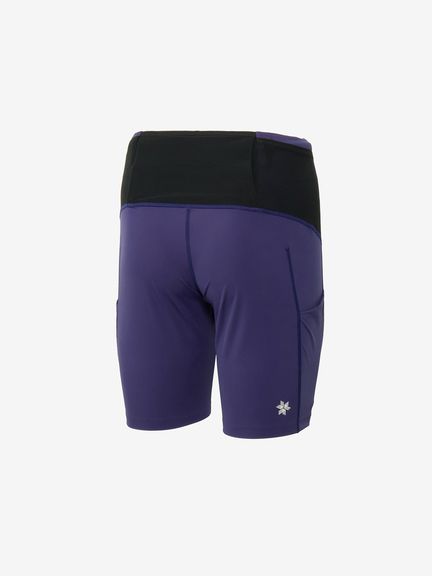 左右の太ももには、カーゴポケットを配置。腰の左右は、メッシュ仕様です。腰中央は、上からアクセスできるポケットと、両サイドからアクセスできるメッシュポケットの2重タイプ。上からアクセスできるポケットは、携帯電話が飛び出しにくいように中央を縫い止める仕様に。サイドアクセスのポケットは、ドリンクなどを入れて走ったときに飛び出しにくいように仕上げました。