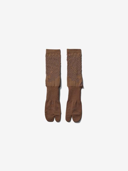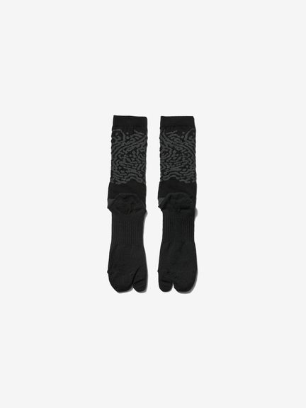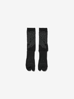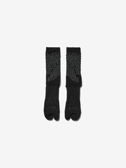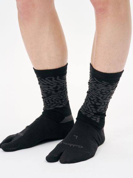 日本では古くから調湿機能があることで重宝されてきた天然由来の素材、紙の糸を使用した足袋ソックス。心地よいドライ感が魅力のソックスに、C3fit独自のサポート構造を取り入れています。また、足首から上には、ヒョウやトカゲ、熱帯魚など自然界の柄に現れる数理モデルを組み込んだ AIを利用してデザインしたアートワークが編み込まれています。