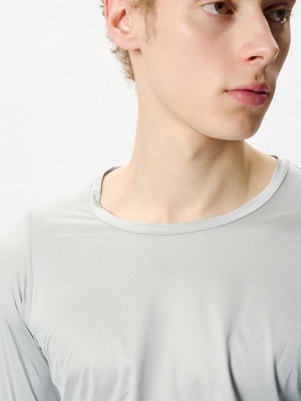 クルーネックのアンダーウエアは、部分的に通気性のあるメッシュ仕様にすることで、接触冷感×通気性を両立させたタイプ。