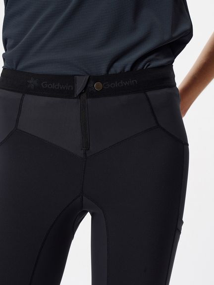 着脱の快適性を高めるため、フロントは前開き仕様。ドットボタン+ファスナーで、開閉が容易にできます。両腿に、スマートフォンなどの収納に役立つカーゴポケット付き。UVガード(UPF30-50+、紫外線カット率90%以上)機能付き(30%伸長時のデータ)。環境への負荷に配慮して、素材の一部にリサイクル糸を使用しています。