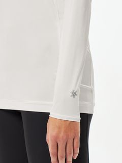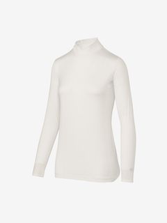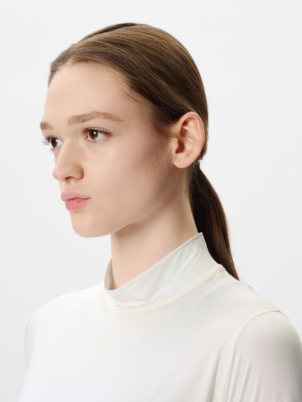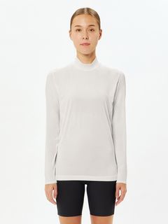 首まわりを日差しからカバーするモックネックのアンダーウエアは、涼感をもたらすスムース生地を全面に採用。熱伝導性が高いナイロン素材をフラットな編み組織にすることで、ひんやりとした涼感機能が持続するのが特長です。