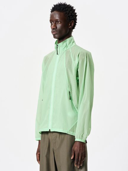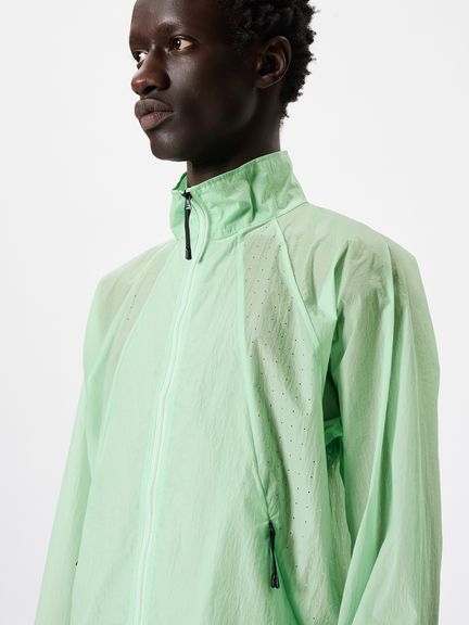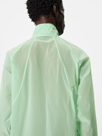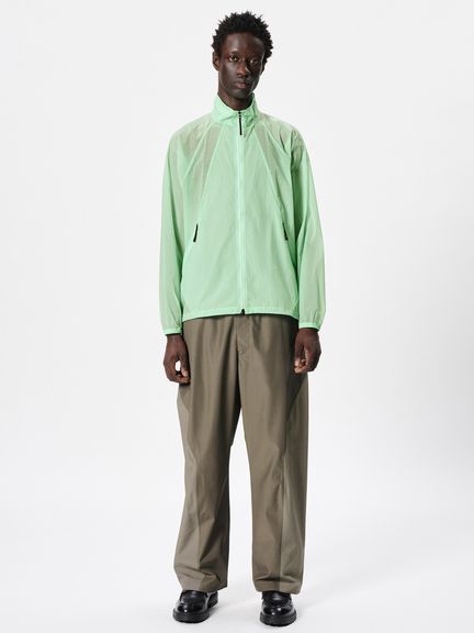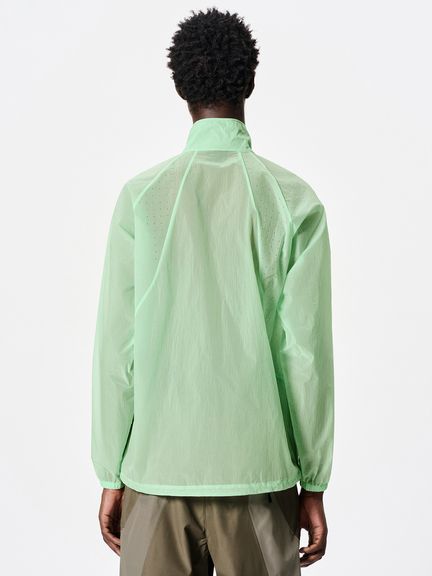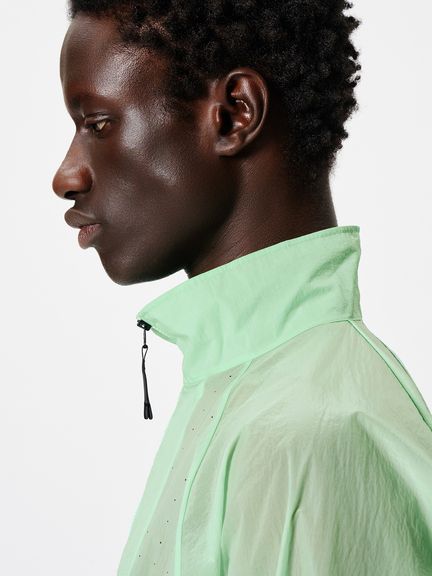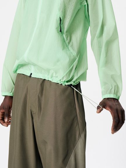 ナイロン素材を平織で薄く仕上げた生地を使用。通気性をもたせるため、脇パネルにはレーザーホールを配しています。