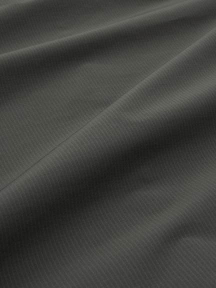 素材のパーテックス イクイリブリウムの特徴は、表裏で密度が異なる二重織り構造。密に織った表側は、強度や防風性に優れ、はっ水性もあるため多少の雨でも対応可能。肌側は、凹凸があり、ベタつきにくく肌離れがよいのが魅力です。