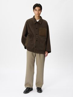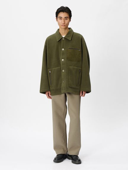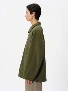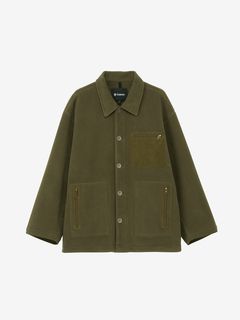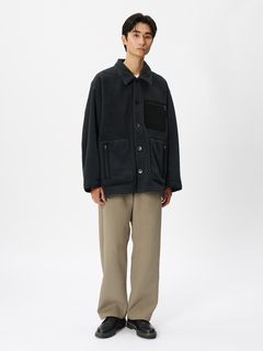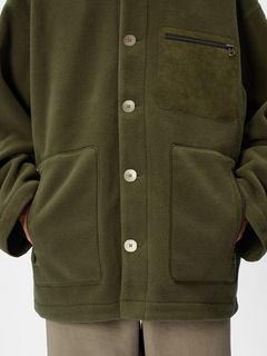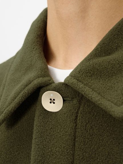 ややゆったりとしたリラックスシルエット。襟を立てて裏側のストラップを留めることでシルエットを変化させ、首元の保温性を高めることができます。高機能の人工スエード素材「Ultrasuede」を部分的に使用し、素材感に変化を与えています。オリジナルの形でデザインした薄手で軽量なアルミニウム素材のボタンを使用しています。