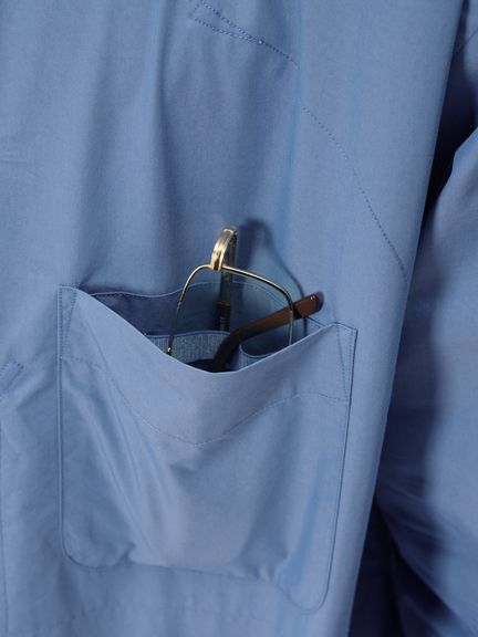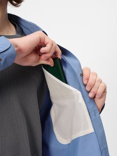 フロントは、上部のみ開閉しやすいスナップボタンにすることで、左胸内側のメッシュポケットへのアクセスが容易。左胸ポケットの中には、メガネやサングラスの落下を抑えるテープを設けています。