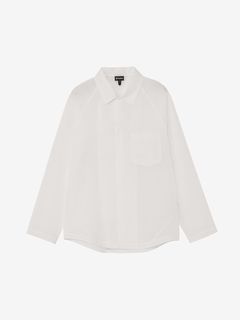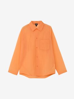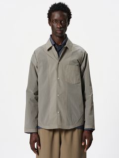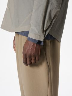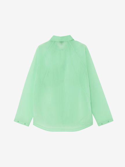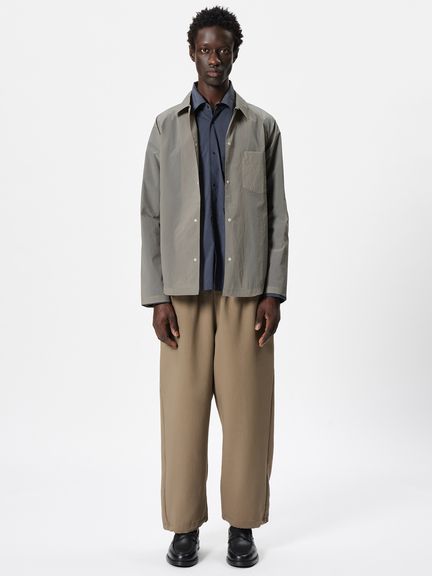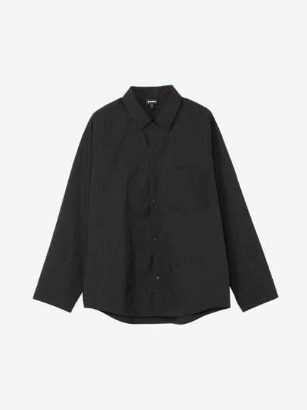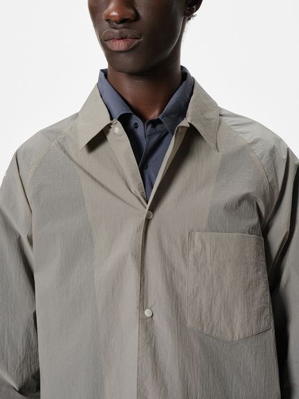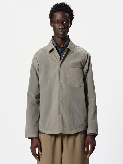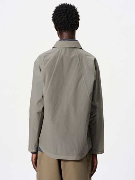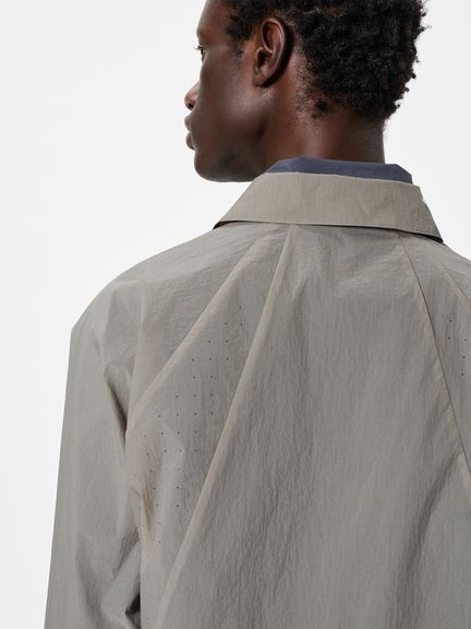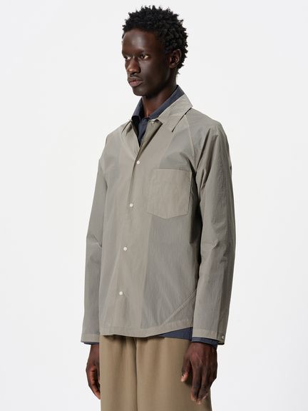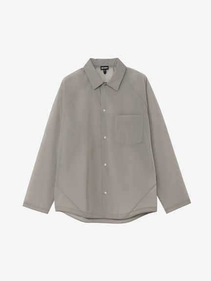 ややゆったりとしたシルエット。フロントや袖口は、開閉しやすいドットボタン仕様です。左胸には、グラスホルダー付きポケットを配置。