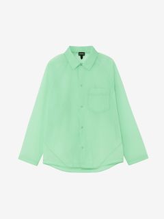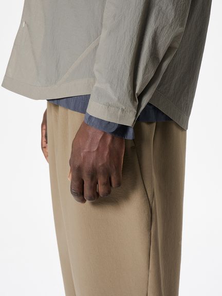 シアー感のある生地の特性を活かすため、表面から透けて見える部分の縫い代にはくるみ縫いの技法を採用し、ミニマルな見え方に仕上げました。