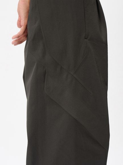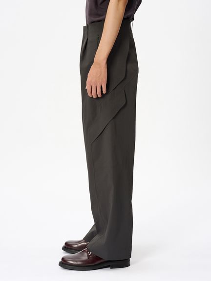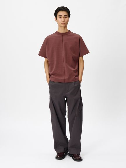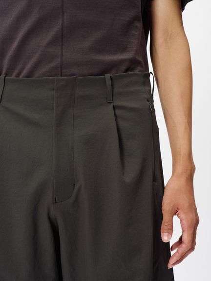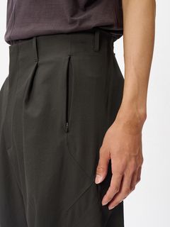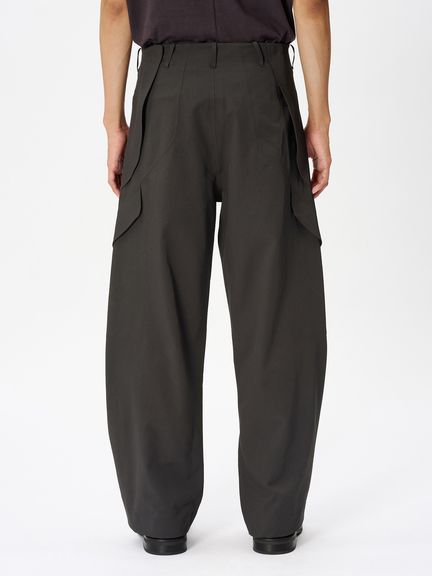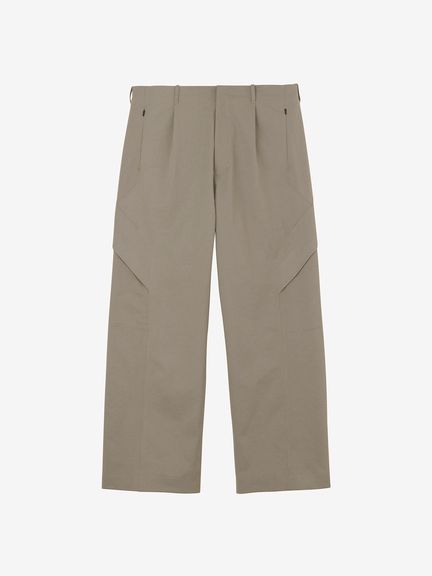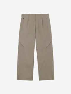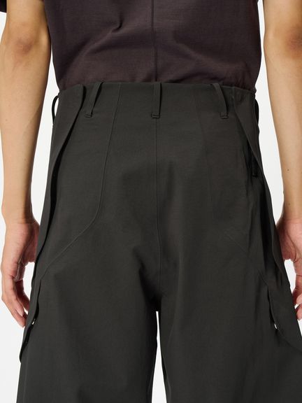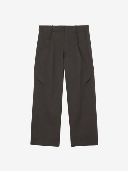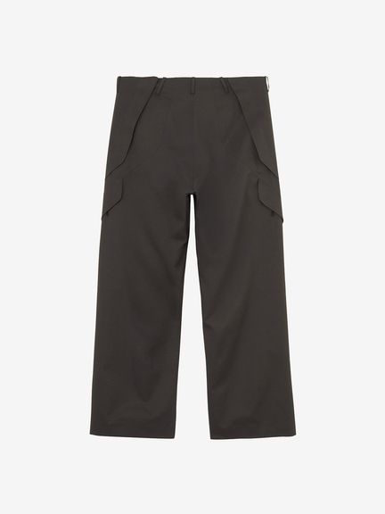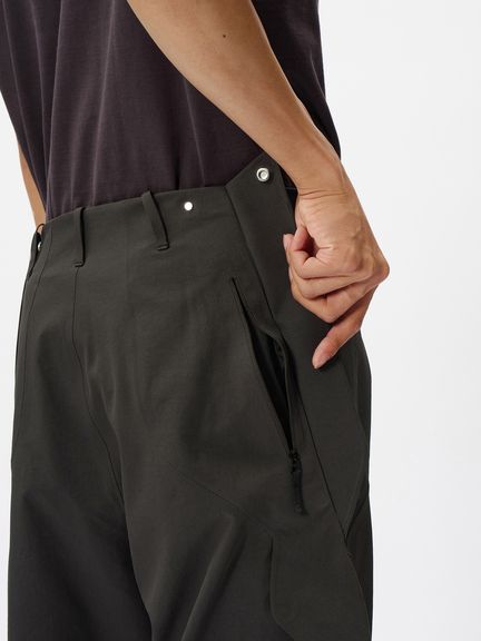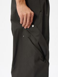 切り替えと繋がったフラップが特徴的なソフトシェルのカーゴパンツ。ボンディングや裏側のシームテープ処理によって、クリーンな外観となっています。テクニカルな素材や仕立てを採用しながら、ドレスパンツのような、すっきりとした腰回りとワイドレッグのシルエットとなっています。