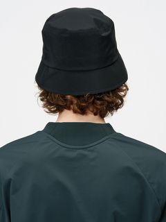 つば部分をやや下向きにしたバケットハットのデザイン。Goldwinロゴのシンボルをイメージした切り替え線だけをきかせ、あえてロゴを表に出さずに、すっきりとした雰囲気に仕上げました。