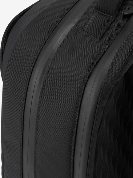 表地には、適度なハリコシが特長の、840デニールのリサイクルナイロンを採用。中空糸を使っているため、丈夫な生地厚でも軽量感があります。