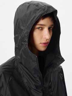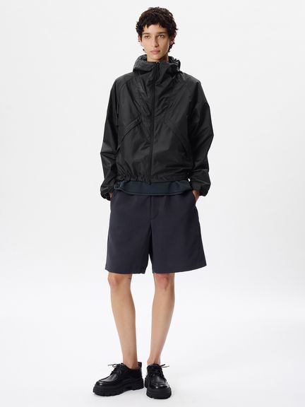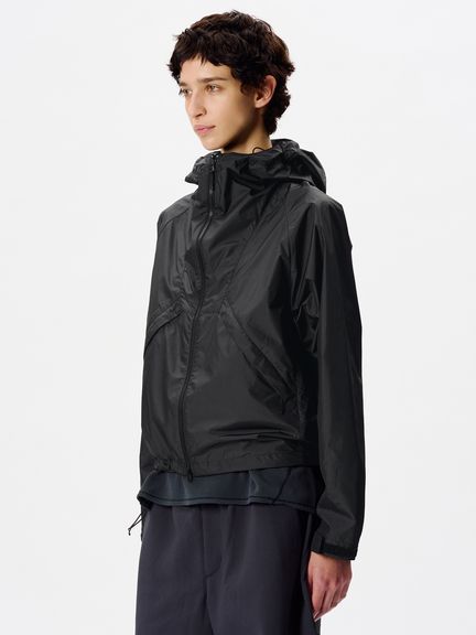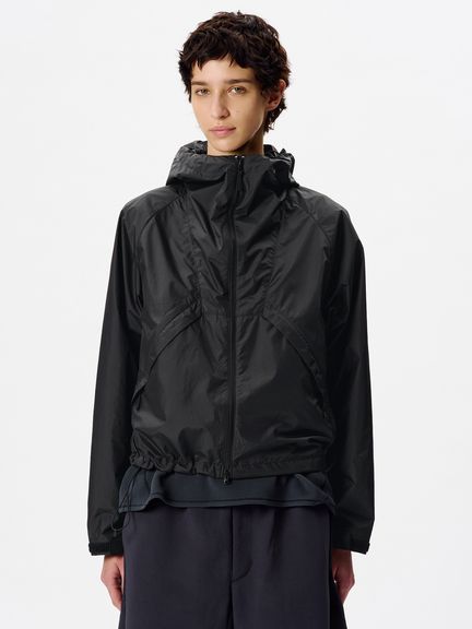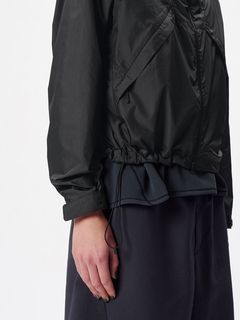 フードからフロントにかけての生地を2重にすることでハリをもたせ、立体的できれいな立ち上がりをキープできます。フードのドローコードを内側に隠すことで、コードの引っ掛かりなどを抑える機能性をもたせつつ、すっきりとしたミニマルな印象に仕上げました。