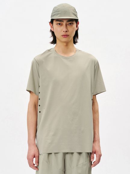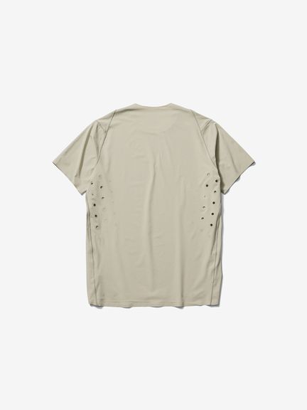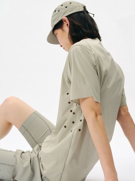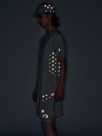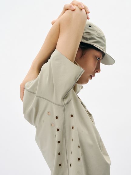 脇下にはベンチレーションを兼ねたホールを配置。ホールとそれと同数のドットを配置したデザインは、通気性と軽量性を高めるとともに、夜間の視認性にも配慮した仕様。「何かを引きながら(ホールをあける)、同時に何かを加える(ホールと対になるドットを新たに配置する)」という発想に基づき、全体のバランスを保ちながら新たな機能を付加しています。
