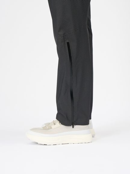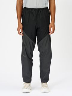 ショートパンツの上から穿きやすいレギュラーシルエット。股下は、走行時に足さばきがしやすいパターン設計。また、シューズを履いたままでも着脱ができるよう両足のひざ下外側部分に止水ファスナーを配置。急な雨でも簡単に着用することができます。また、裾内側部分は擦れによるダメージを少しでも軽減するために切り替え線を後ろ側にずらした設計になっています。正面と背面にあしらったロゴは、夜間の視認性を高めるリフレクト仕様です。