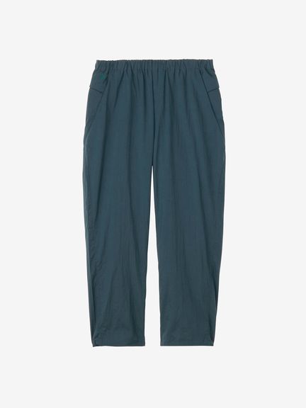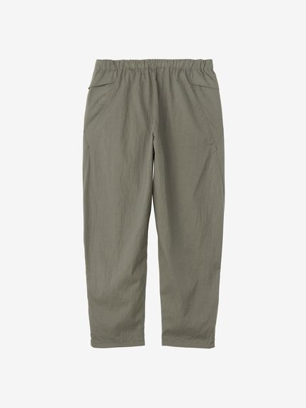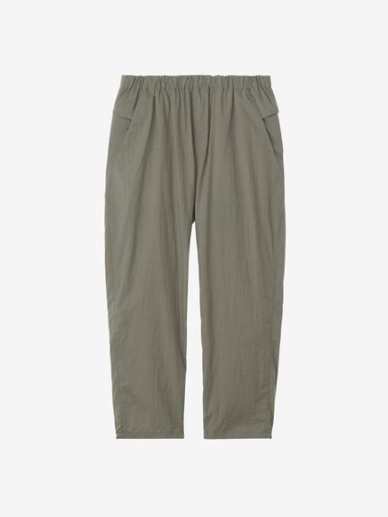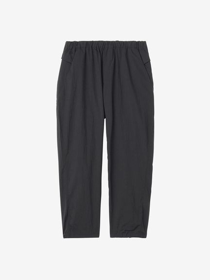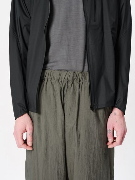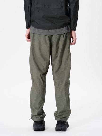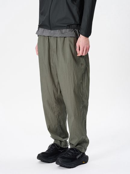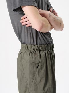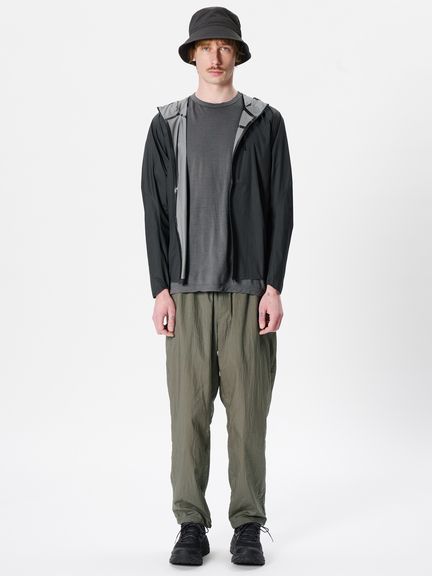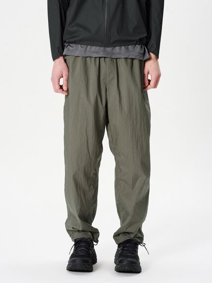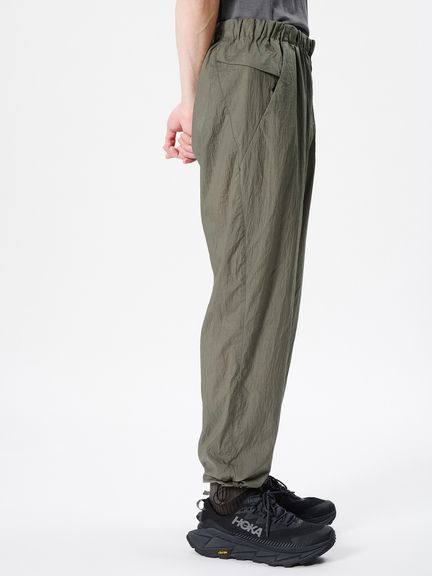 衣服内で空気が循環しやすいためムレにくいリラックスシルエットで、ひざ下は足さばきを考慮したテーパード仕様。裾のドローコードを絞ることでシルエットの変化を楽しめます。ローカットシューズと合わせたときに生地だまりしにくいアンクル丈(9分丈)です。