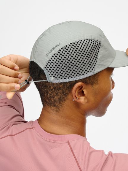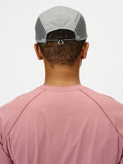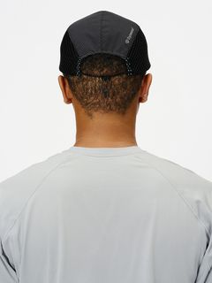 背面のドローコードでフィット感の調節が可能。つばはとても短いため視界が広く、跳ね上げがしやすいので、トレイルランニングなどでより広い視界を確保したいときにも重宝します。ロゴは、夜間の視認性を高めるリフレクト仕様。