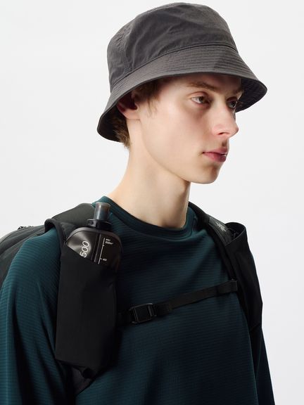 両サイドにトレッキングポールやボトルを収納できるポケットを、ショルダーハーネスにはボトルホルダーを配置しています。