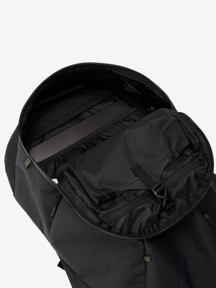 こだわったのが、背負ったときに重さを感じにくい構造。メインコンパートメント内にハーフポケットを付け、そこに重量のある荷物を入れることで重心が上部になり、軽く感じられるのが特長。さらに、ボトム部分を腰に沿うようにフィットさせる構造にして揺れを軽減することでも、体感重量を軽くしています。
