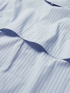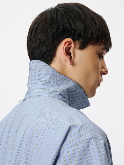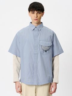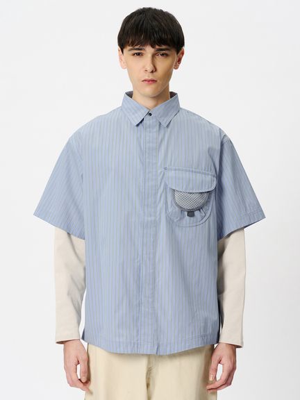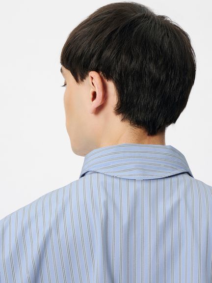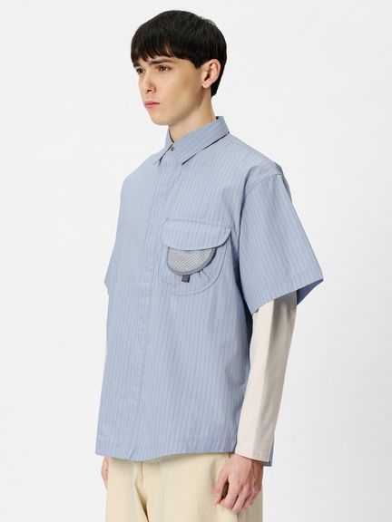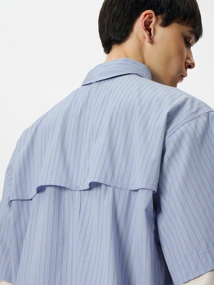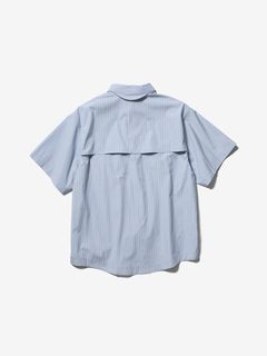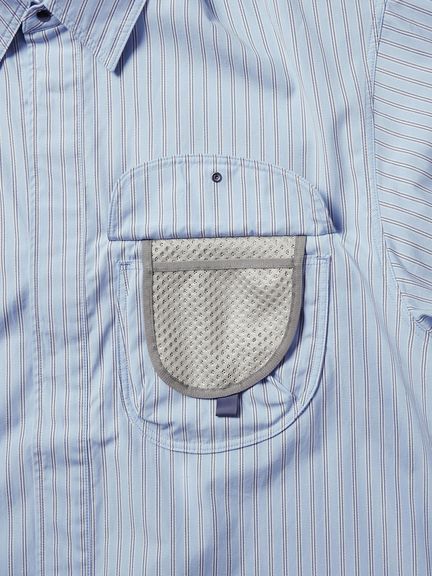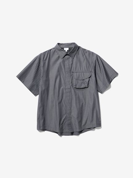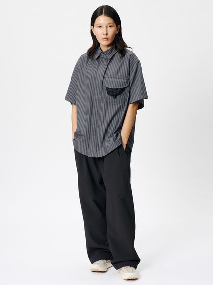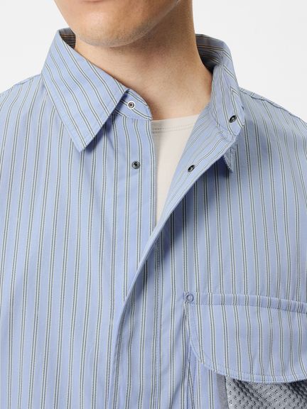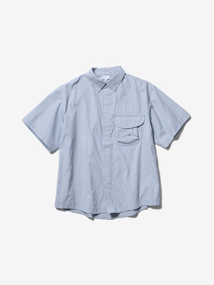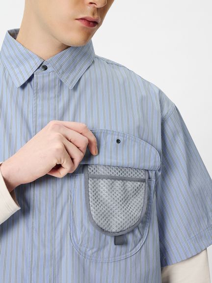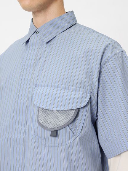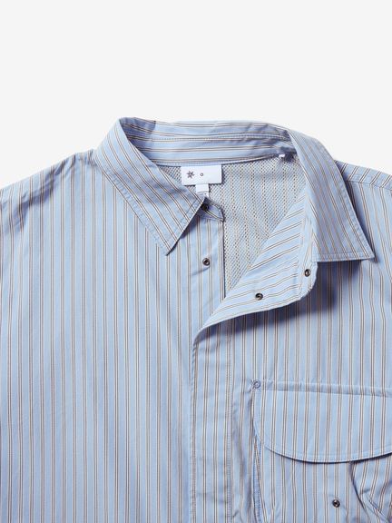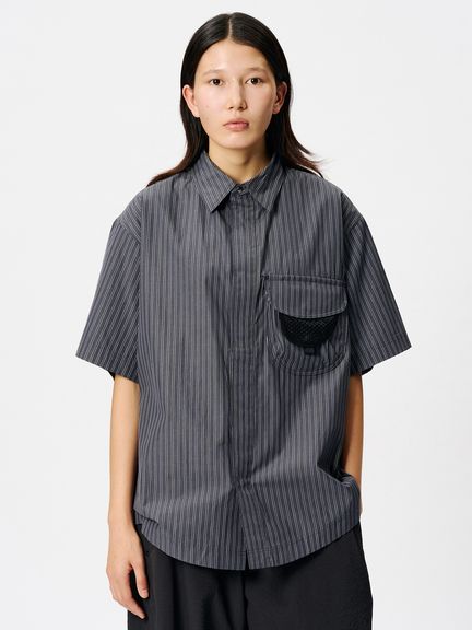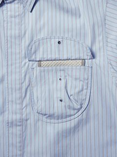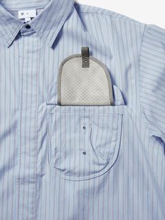 クラシックなストライプ柄の中に再帰反射糸を織り込んだ、オリジナルの生地で仕立てたショートスリーブシャツ。