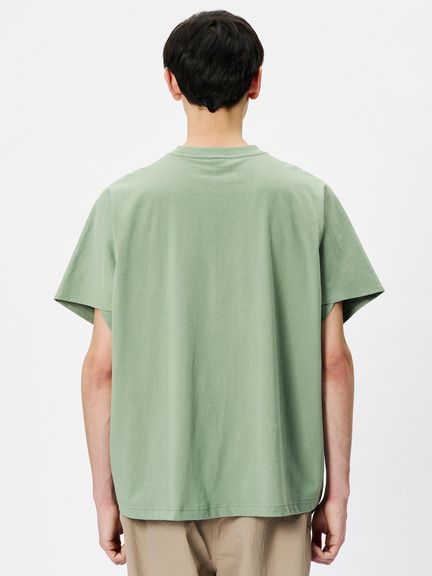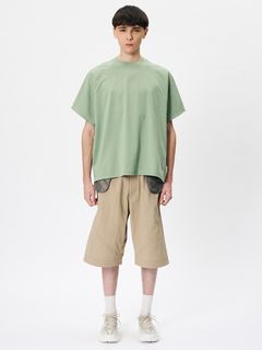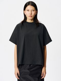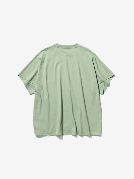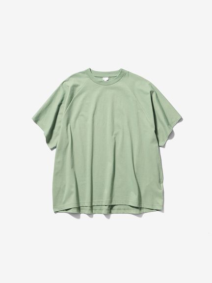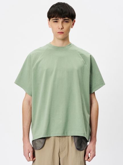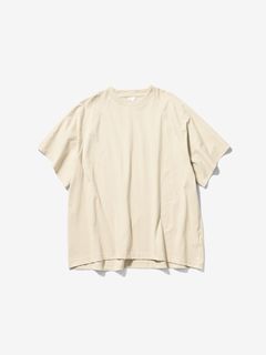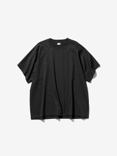 サイドに縫い目のない丸胴の生地を用い、さらに、袖もそのままボディに続いた生地を回転させるようにして構成することで、全体が1ピースのみでつくられたTシャツ。縫い目を極力少なくすることで、動きやすくユニークなフィットを生み出しています。