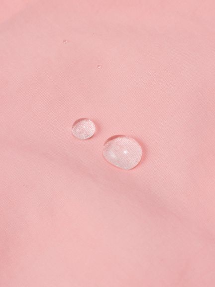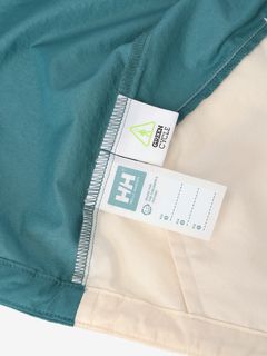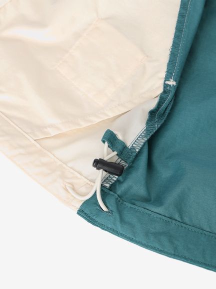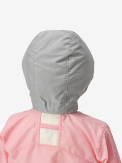 ドライ感のあるコットンライクな風合いの生地を採用。はっ水加工を施しているため、多少の雨なら対応できます。フードの顔まわりと袖口はゴム仕様でフィット。裾はドローコードで絞れます。フロントファスナーは、子どもでも開閉しやすく、横方向に強く引くと外れる、安全性を考慮したQuick Freeファスナーを使用。後ろ裾にはSOLAS条約(海上人命安全条約)に準じたリリフレクティブワッペンを配し、夜間や悪天時の視認性を向上させています。