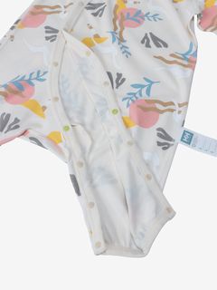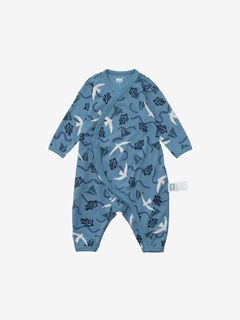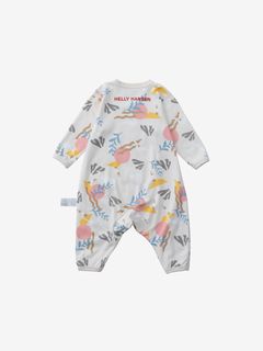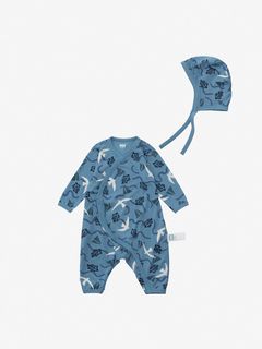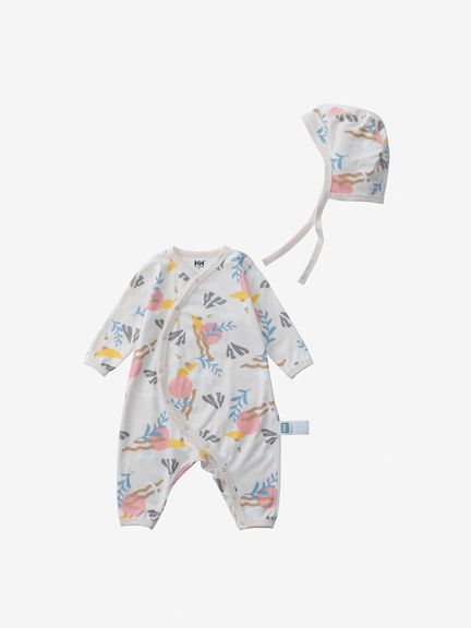 灯台やサンゴなど海をモチーフにした総柄デザインのロンパースと帽子のセット。