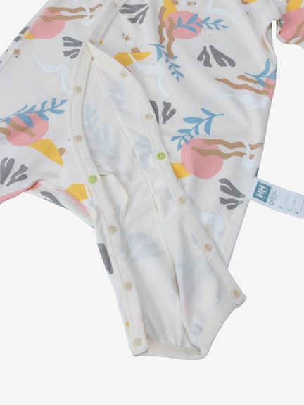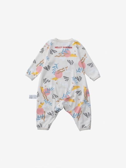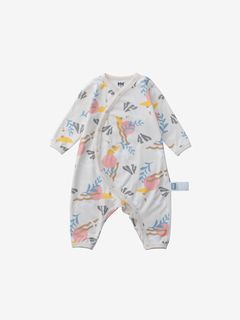 ロンパースの前面は、開閉がしやすいゆとりのあるシルエットにしました。股のボタンは、掛け違いを軽減できる色付きタイプです。