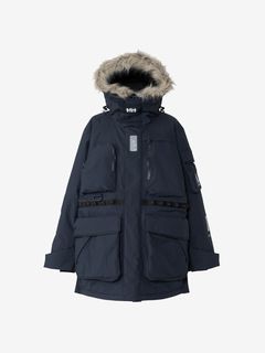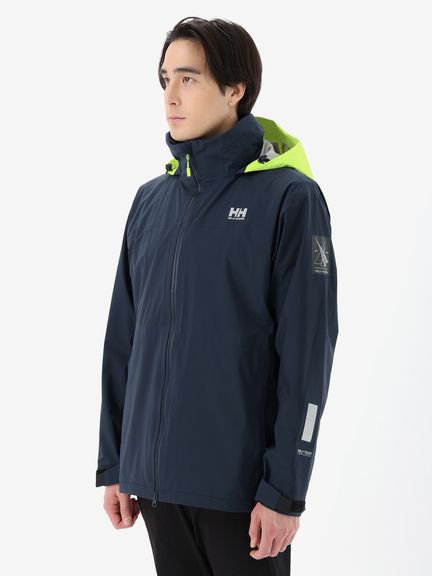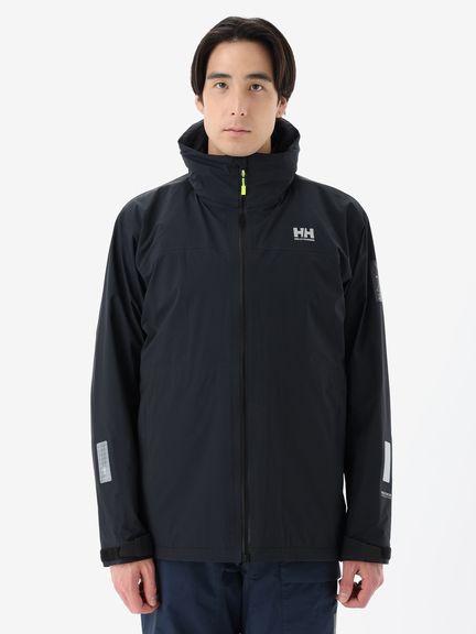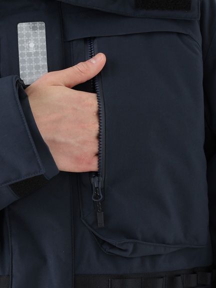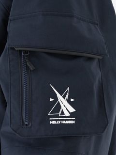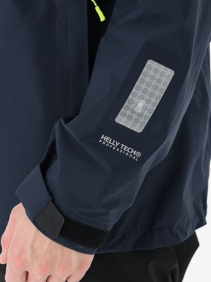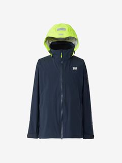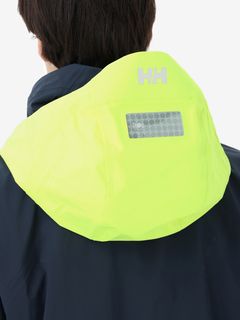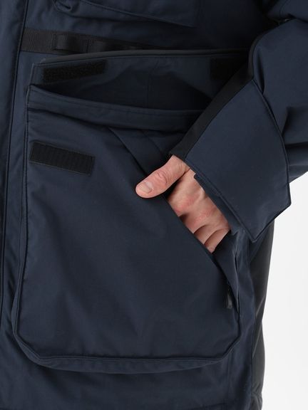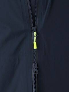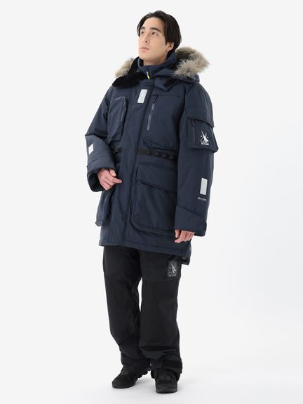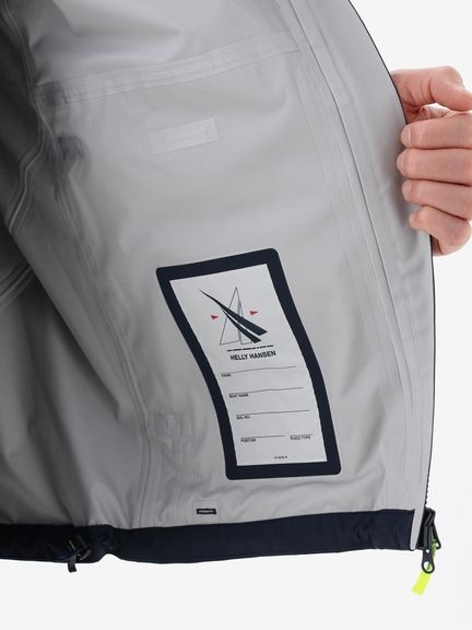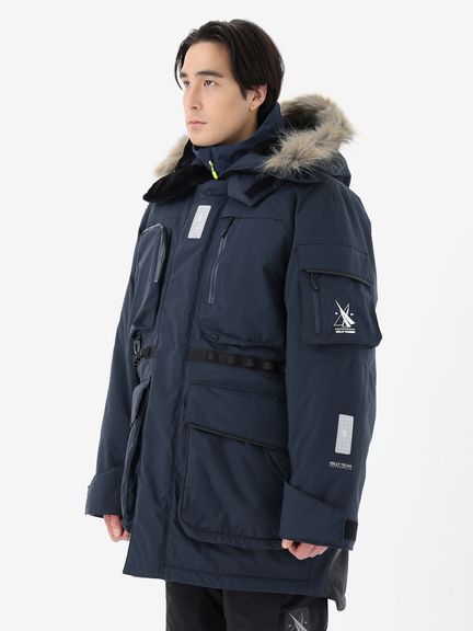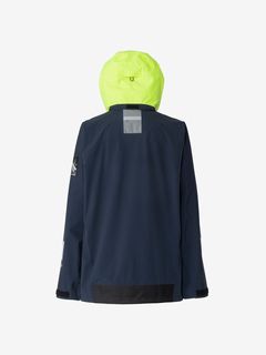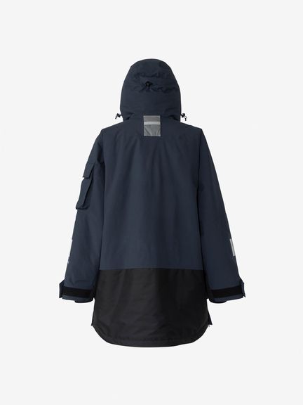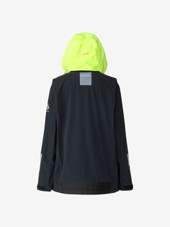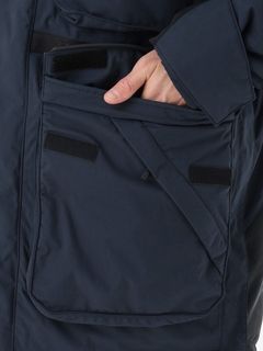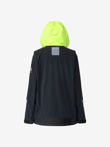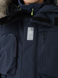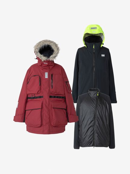 [1]中わた入りの防水ジャケット(アウター)、[2]ストレッチ性のある3レイヤー生地の防水ジャケット(シェル)、[3]中わた×フリースのミッドレイヤー(インナー)のセット。[1]は、厳しい寒さに対応できる防水のアウタージャケットで、腰まで覆う長めの丈に設計。表地に強度が高いコーデュラを採用しており、セーリングシーンで擦れやすい腰まわりと袖口は、さらにコーデュラで補強。中わたを160g封入することで保温性を高めました。収納力にもこだわり、サングラスを入れられる右胸のポケットや腰の立体ポケットなど、セーリングで必要なデバイスを入れやすい多彩なポケットを配置。フードのファーにボリュームをもたせ、襟を高く設計することで、顔に雪がかかりにくくなっています。[2]は、汎用性の高い防水シェルジャケット。セーリングシーンでの動きやすさを重視してストレッチ性の高い生地を使用し、裾はコーデュラで補強しています。フードは、シーンに合わせて収納できるビルトイン仕様です。[3]は、セーリングシーンでの動きを想定して、中わたとストレッチフリースを適材適所に配したミッドレイヤー。身頃には、高機能中わたのLIFAロフトを封入。LIFAロフトは、ポリプロピレンとポリエステルを使った中わたで、一般的なポリエステルわたに比べて糸レベルで約20%軽量。薄くても高い保温性をキープできます。素材特性により、スプレーや汗で濡れてもロフトを維持しやすいのも利点です。袖部分は、動きやすいようストレッチフリースに切り替えました。フロントファスナーは、レイヤリング時のアウターとの干渉を軽減するため、スラントファスナーにしています。