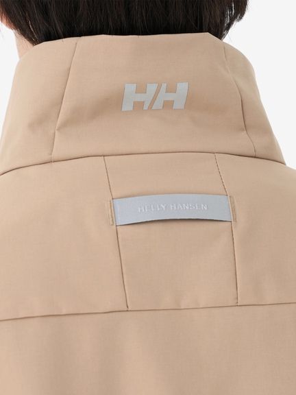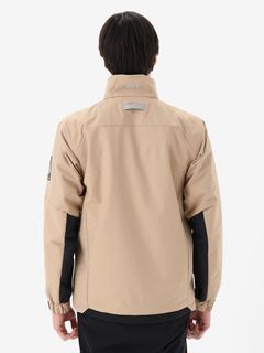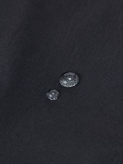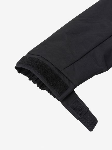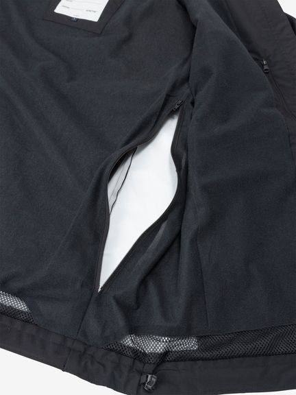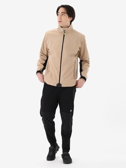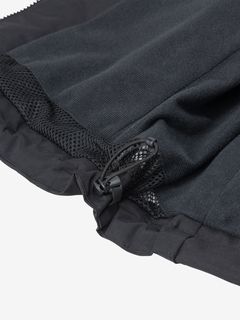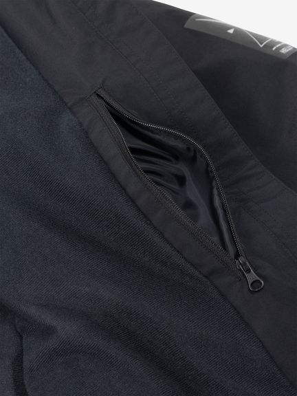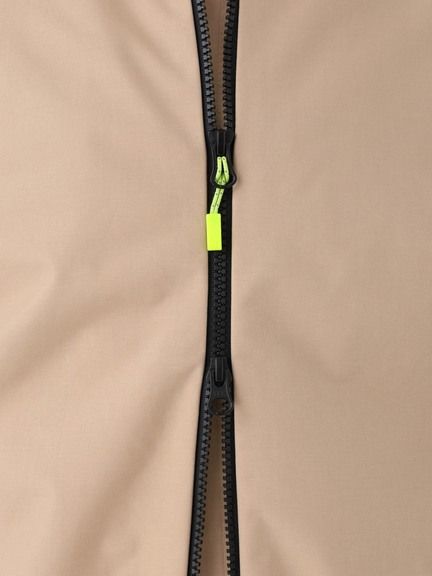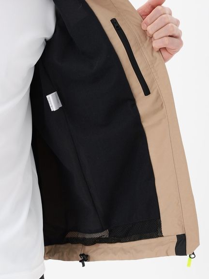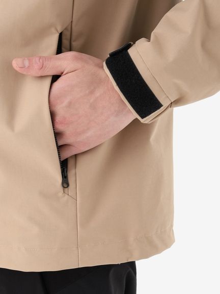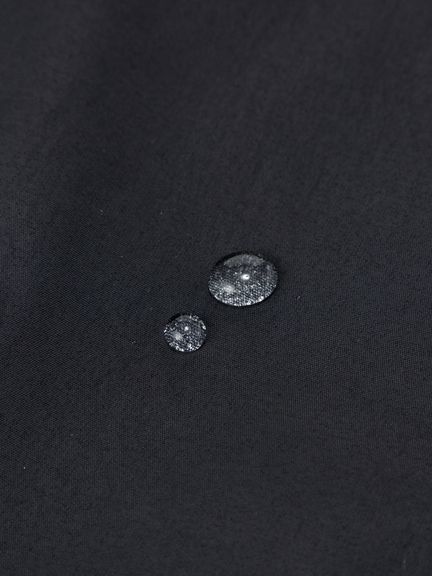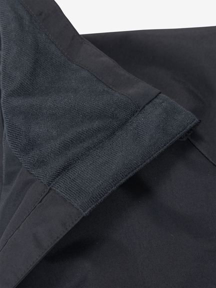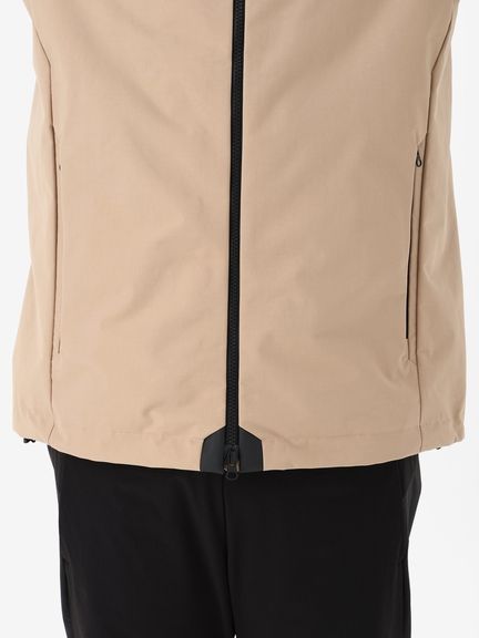 強度のあるリサイクルナイロン(リサイクル原料率53%)を使用した2層構造の生地には耐水性と透湿性があり、さらに耐久はっ水加工を施して、スプレーや雨を弾きやすく仕上げています。防風性も高いため、冷たい風から体を守れるだけでなく、起毛トリコットの裏地付きで程よい保温性も備えています。