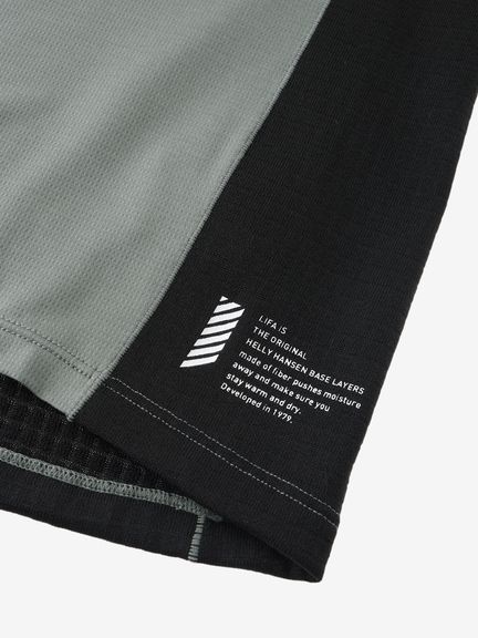 さらに、汗や水濡れによる不快感を軽減するため、汗をかきやすい背面には肌当たりがよく、汗をかいてもベタつきにくいLIFA素材のグリッドフリースを配置しています。LIFAは、優れた疎水性のある素材、ポリプロピレンを使用しているのが特徴的。繊維内に水分を含みにくい素材特性に加え、生地を高密度に編むことで、より水を吸収しにくくしています。