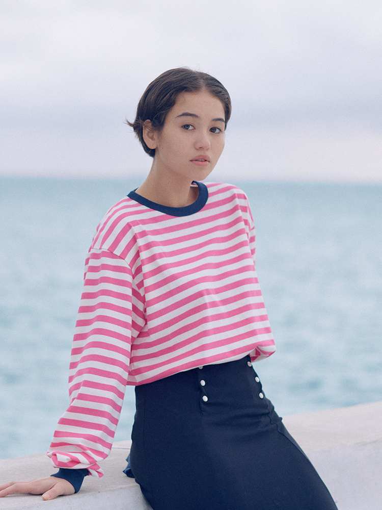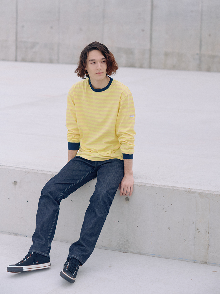 海由来の環境配慮型素材を採用した丸首のボーダーTシャツ。