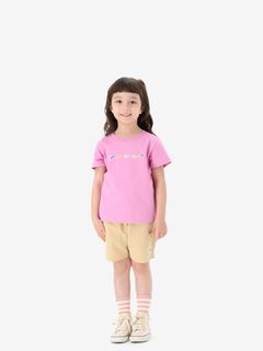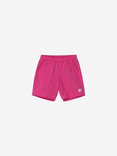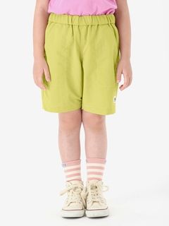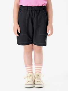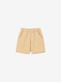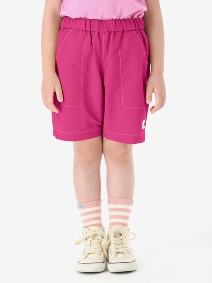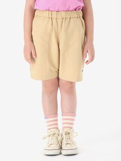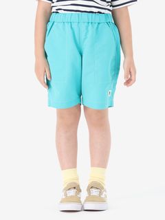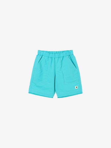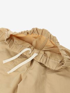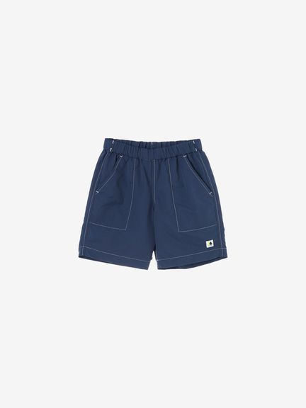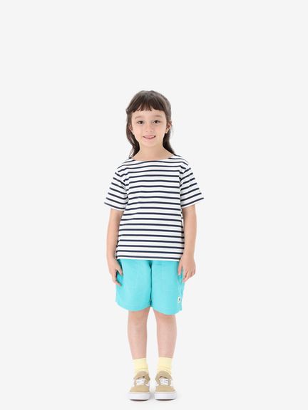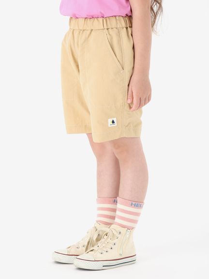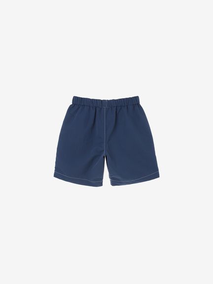 動きやすさを考慮して、深めの股上設計で、股下にはガゼットを配置。ウエストは、ゴムシャーリング+ドローコードで調節できるリラックス感のある仕様。白のステッチで配色感を効かせ、さりげないマリンテイストをプラスしたデザインです。左裾には、キッズ向けウエアオリジナルのツインセイルロゴのピスネームを配しました。