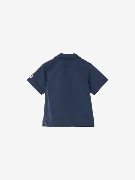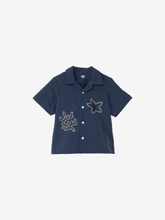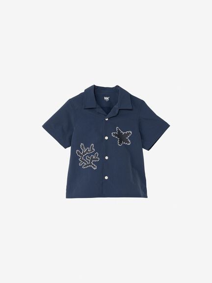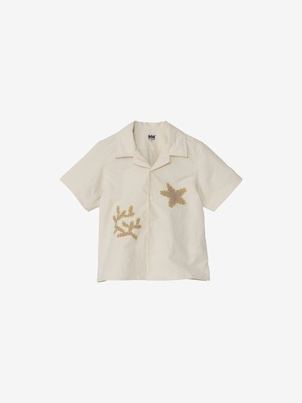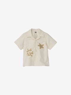 ボックスシルエットで、ネックラインは開襟タイプ。フロントに、サンゴとヒトデのアップリケ風プリントをあしらっています。左袖には、キッズ向けウエアオリジナルのツインセイルロゴのピスネームを配しました。