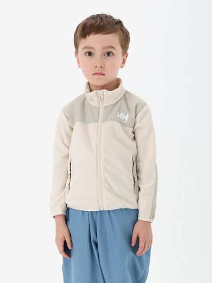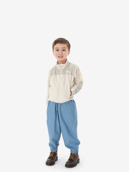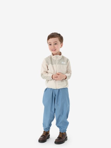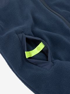フロントファスナーは、子どもでも開閉しやすく、横方向に強く引くと外れる、安全性を考慮したQuick Freeファスナーを使用。後ろ裾に、目立ちやすいフラッシュイエローのテープを配置しています。右ポケット内には、鍵や防犯ブザーなどを掛けられるキーループ付き。寒いときや雨の日は、防水ジャケットとのレイヤリングがおすすめです。