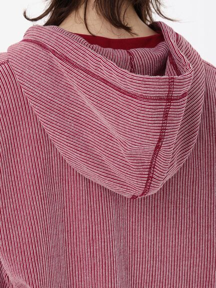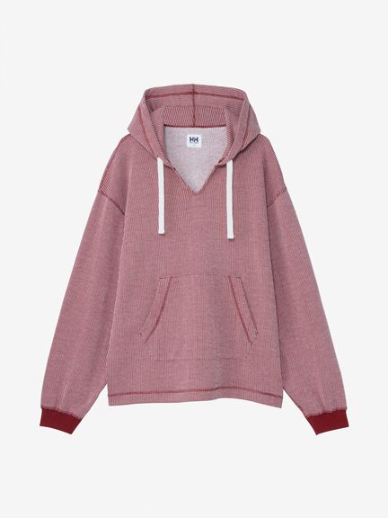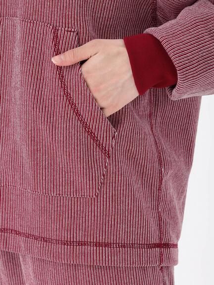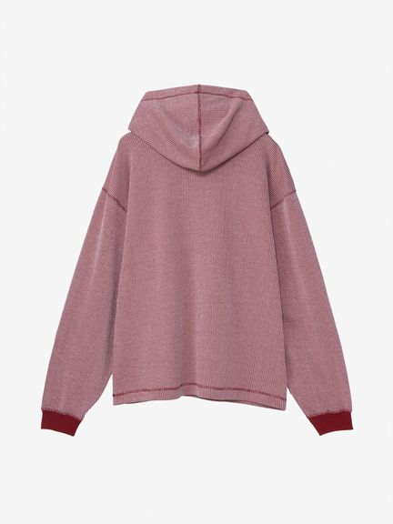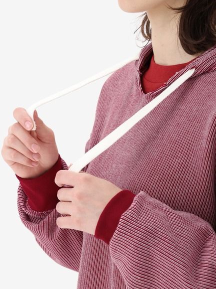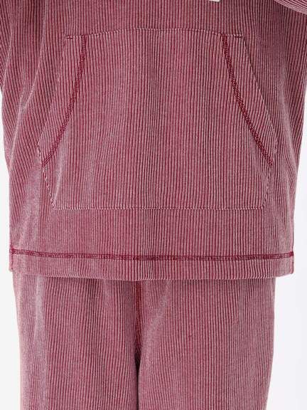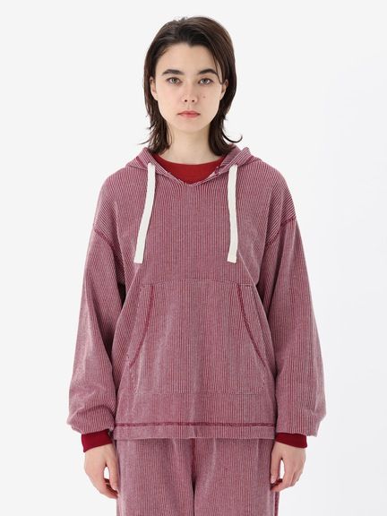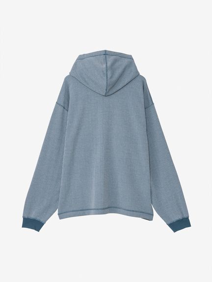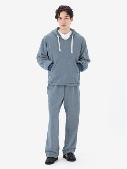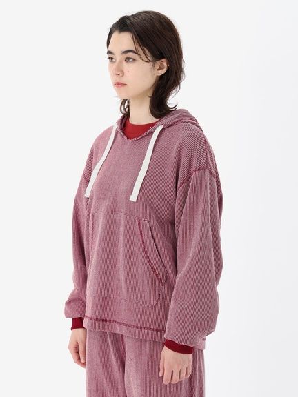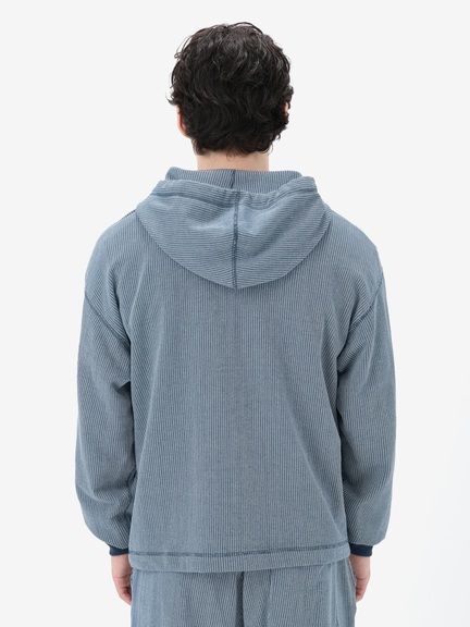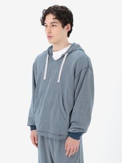 海上がりにざくっと羽織るメキシカンパーカ(バハフーディ)をイメージした、リラックス感のあるゆったりとしたシルエット。編地でさりげないストライプ柄を表現しています。においを発生から抑える、抗菌防臭のポリジン・ステイフレッシュ加工を採用。UVケア(UPF15-30、紫外線カット率85%以上)機能付き。同シリーズのパンツとのセットアップもおすすめです。環境への負荷に配慮して、素材の一部にリサイクル糸を使用しています。