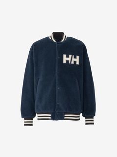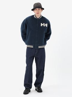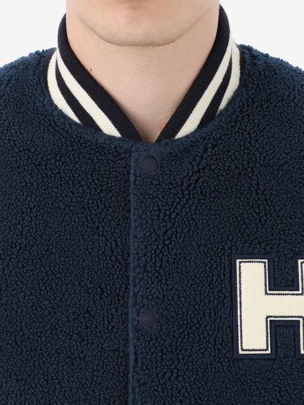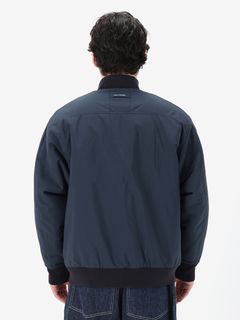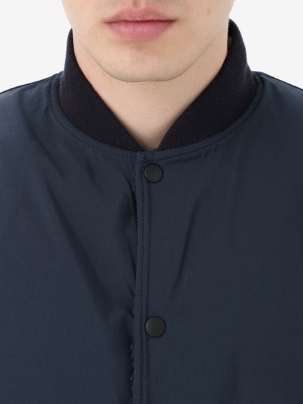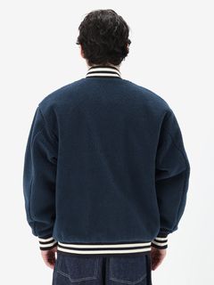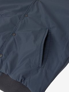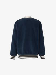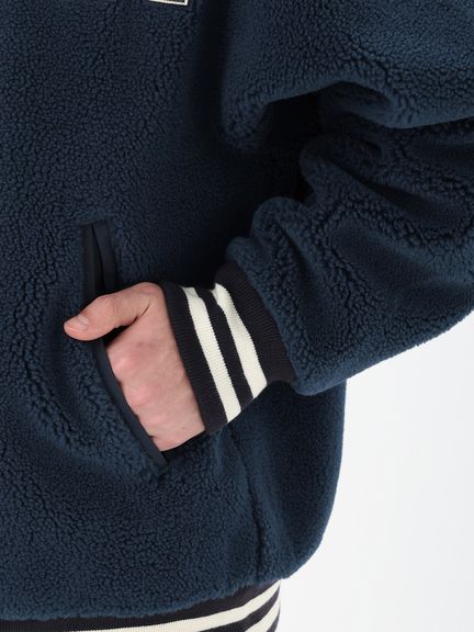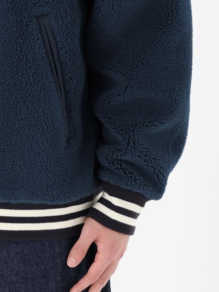 スタジャンらしい配色感のあるA面に、ファイバーパイルを採用。リサイクルナイロンのタフタ生地が表になるB面は、ボアがデッドエアをためやすく、暖かな着こなしができます。袖部分は、着用時のすべりがよくなるよう、中わた入りの布帛生地に切り替え。厚手のインナーと重ねられる、ゆったりとしたシルエットです。