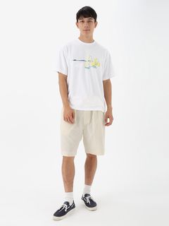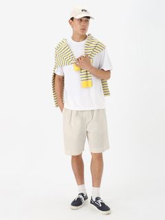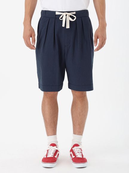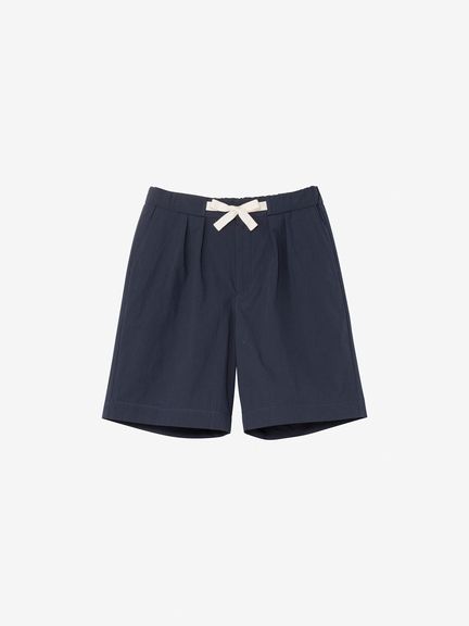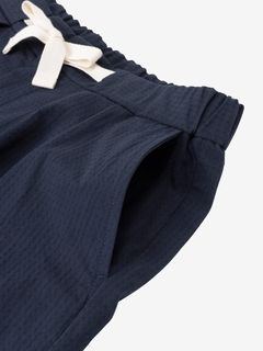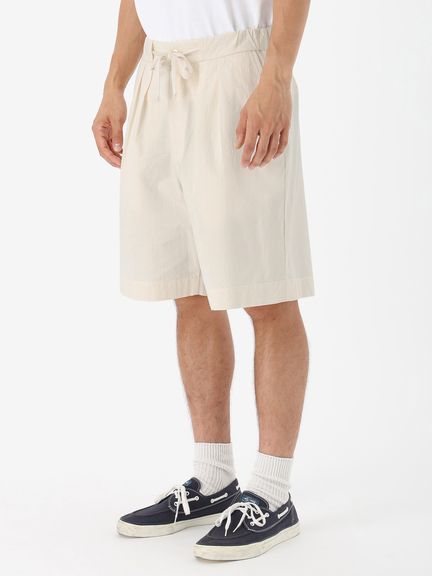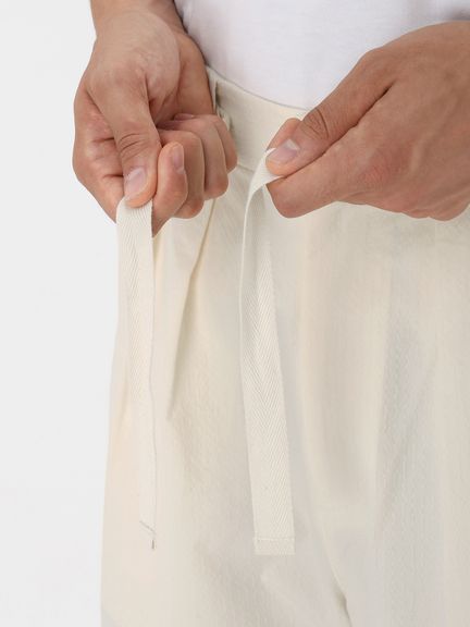 ウエストにツータックを入れたワイドシルエットで、丈はやや長めのミドル丈に設計。ウエストはゴムシャーリング+コットン紐で、リラックス感をもたせました。