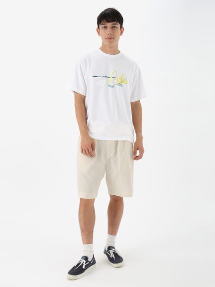 オーガニックコットンとペットボトルが原料のリサイクルポリエステル糸を使用した環境配慮型素材を使用しており、吸汗速乾性を備えています。ドビー織の生地にすることで、肌と点接触になりさらりと着られ、ナチュラルな風合いが楽しめます。コットン100%の生地に比べ、形態安定性が高く、シワになりにくいのも魅力です。