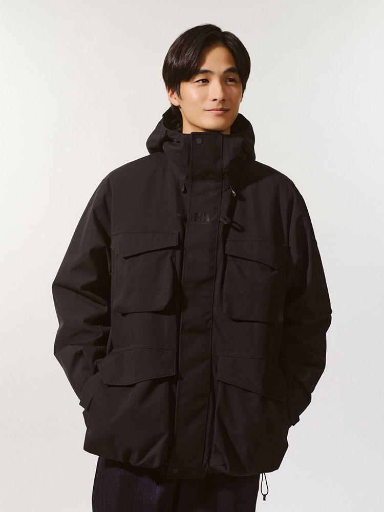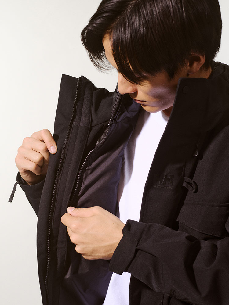 デザインポイントとして、セーリングジャケットを彷彿させる、マチ付きのアウトポケットを配置しています。保温性のあるミドラーの「Naeroy Down Jacket」「Zip Insulation Jacket」「Lyse Fleece Jacket」「Lyse Fleece Vest」と連結できるZip in Zip仕様。環境への負荷に配慮して、リサイクル糸を素材の一部に使用しています。