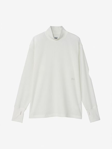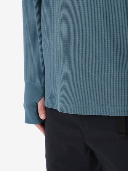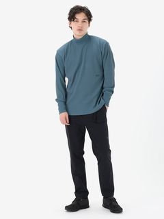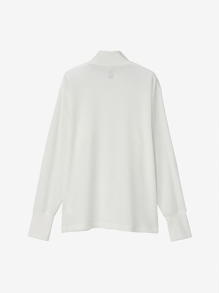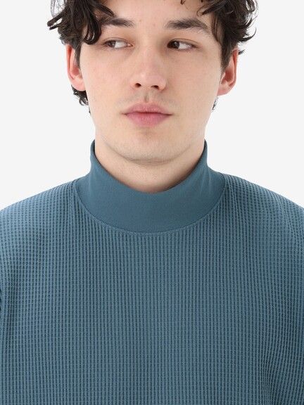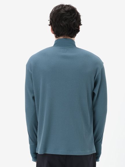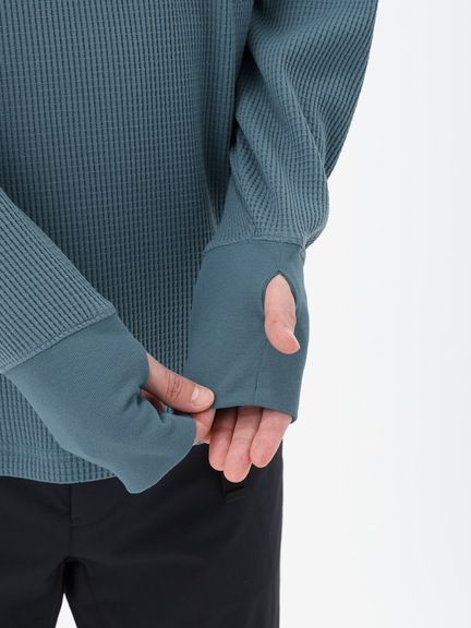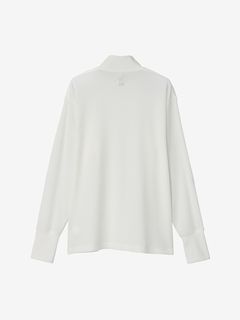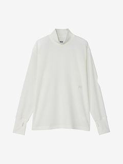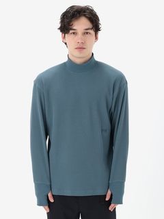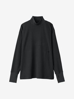 さまざまなシーンで着やすいレギュラーシルエットで、控えめな高さのハイネック仕様。同色の刺繍ロゴをあしらったシンプルなデザインです。サムホール付きの袖は、伸ばすと手の甲まで覆える長さに設計。環境への負荷に配慮して、素材の一部にリサイクル糸を使用しています。