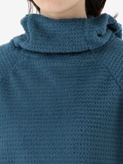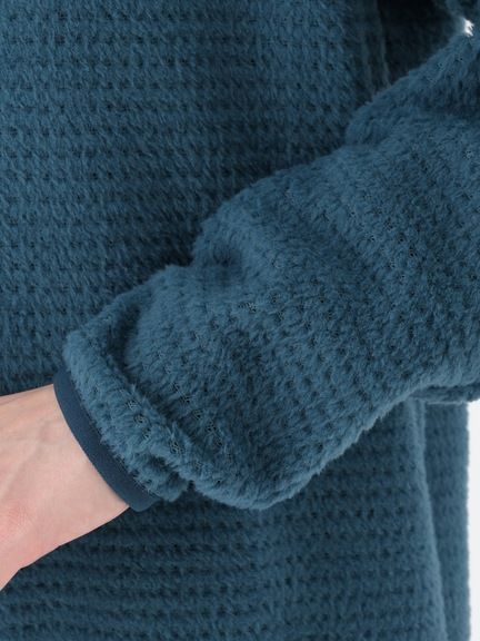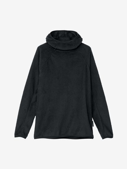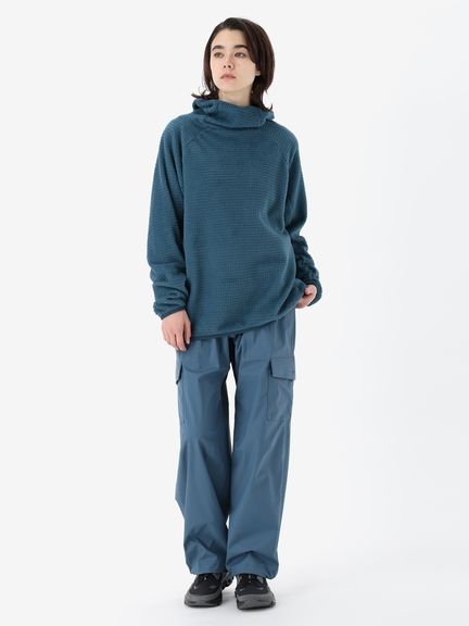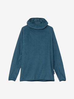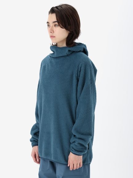 アウトドアシーンでのミドラーとして着用しやすい、ややタイトなフィット感。バラクラバのように口元まで覆えるフーディ仕様です。環境への負荷に配慮して、素材の一部にリサイクル糸を使用しています。