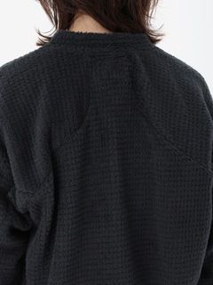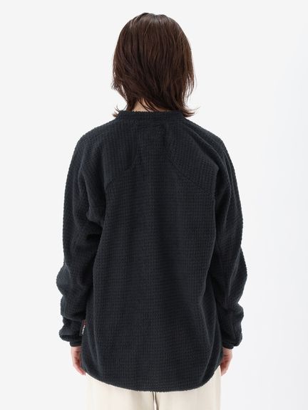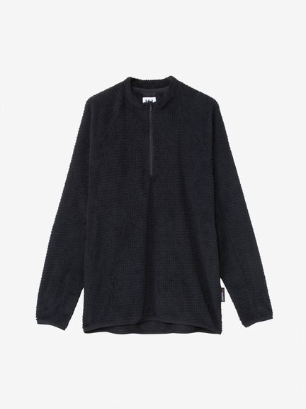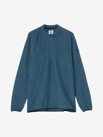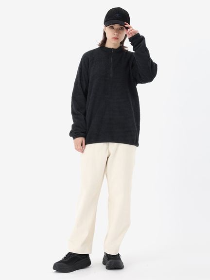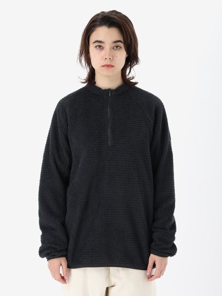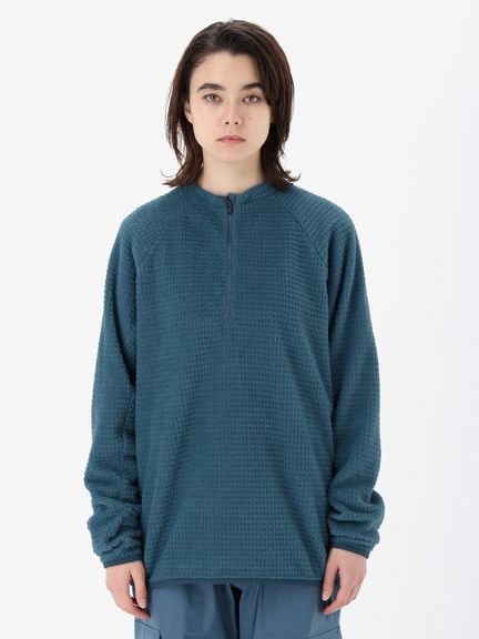 アウトドアシーンでのミドラーとして着用しやすい、ややタイトなフィット感。着脱しやすいハーフジップ仕様です。環境への負荷に配慮して、素材の一部にリサイクル糸を使用しています。