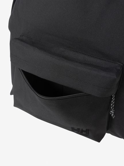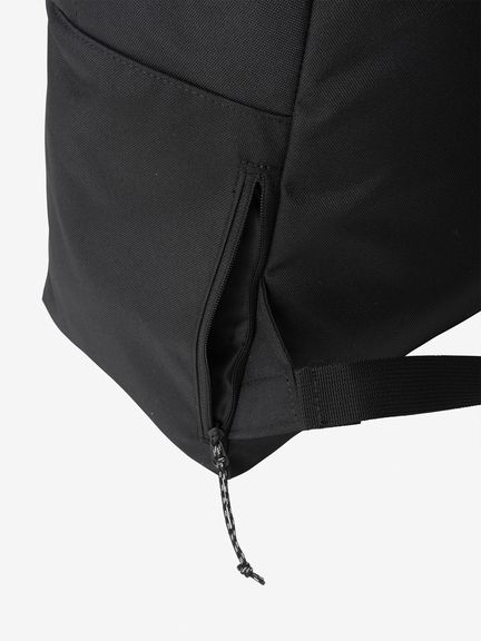 背面パネルのサイドにファスナー付きの隠しポケットがあり、財布や携帯電話の収納に重宝。フロントポケットにロゴ刺繍をあしらったシンプルなデザイン。日常づかいしやすい中型サイズです。