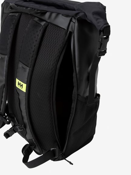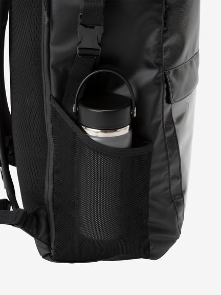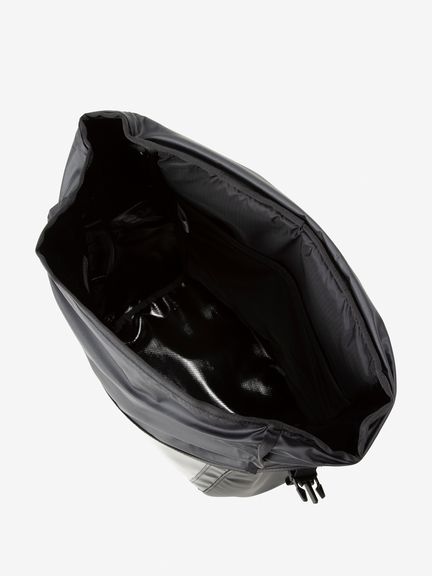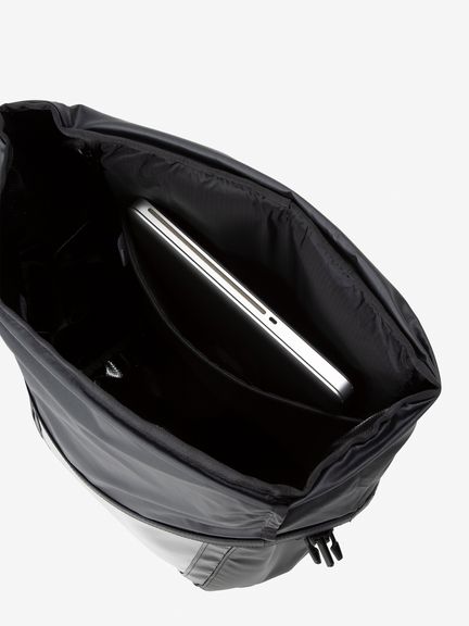 開閉部はロールトップタイプで、サイドでもトップでもバックルにて固定が可能。メインコンパートメントには、背面に配したファスナーを開け、サイドからもアクセスできます。