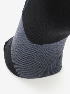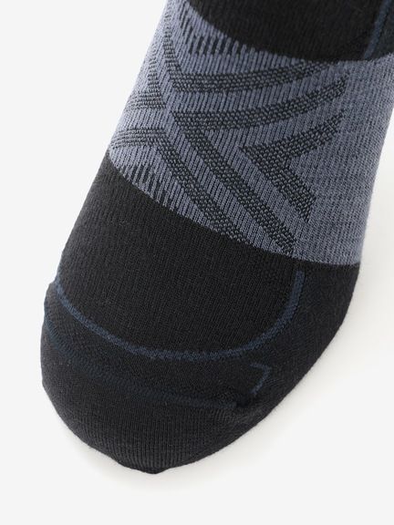 生地は、メリノウールにナイロンやポリウレタンを混紡し、強度と伸縮性を高めています。部位により編み組織を変えることで、それぞれに必要とされる機能を確保。甲は、通気性のあるメッシュ構造に。擦れやすいかかととつま先部分は補強し、インステップサポートでフィット性を向上させています。左右非対称のオブリークタイプです。